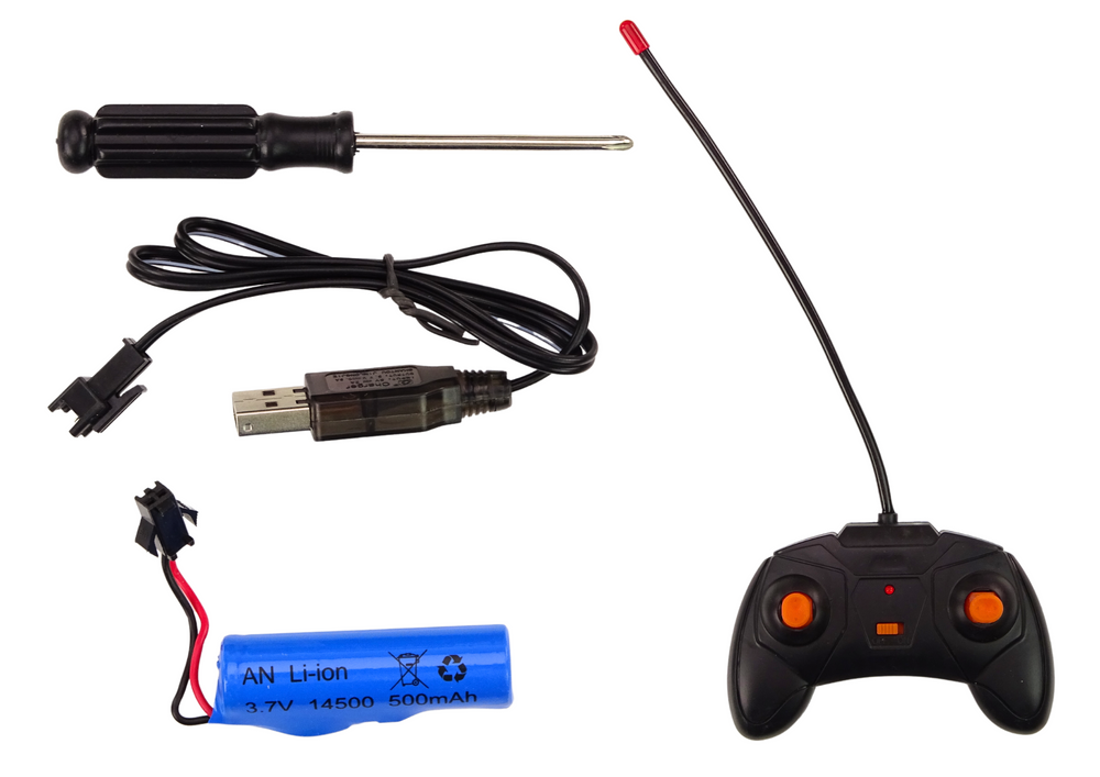 Autko zasilane jest na akumulator 3.7V 500mAh, który jest elementem zestawu. Do akumulatora dołączona jest ładowarka.