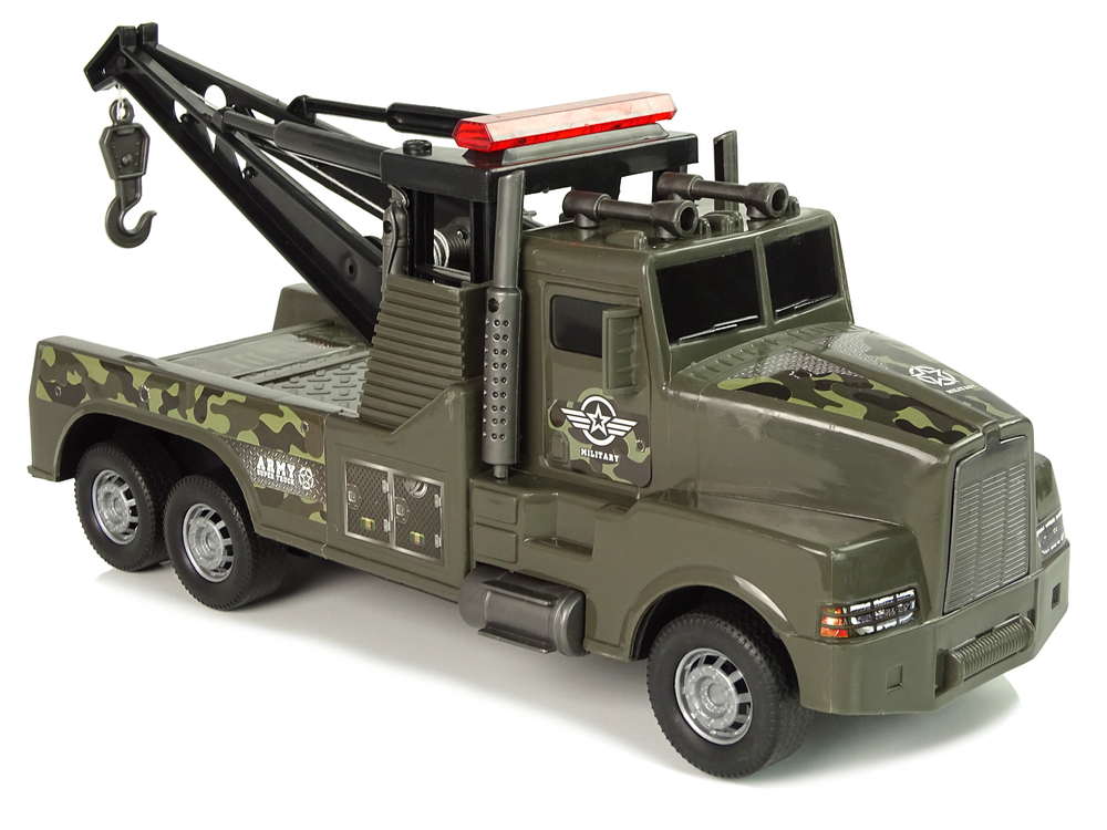 Całe autko jest w kolorze moro z naklejkami wojskowymi, idealne dla fanów militariów. Każdy szczegół jest idealnie odwzorowany. W tylnej części autka znajduje się dźwig wraz z linką holowniczą, która wysuwana jest za pomocą korbki, która znajduje się na boku autka. Na samym końcu zamontowany został hak, wystarczy zaczepić inną zabawkę i przetransportować w odpowiednie miejsce na polu bitwy czy kraksy. Po pociągnięciu do tyłu i popchnięcie w przód osiągnie super prędkość, ponieważ posiada napęd frykcyjny. Pojazd, który uzupełni kolekcję Twojego malucha.