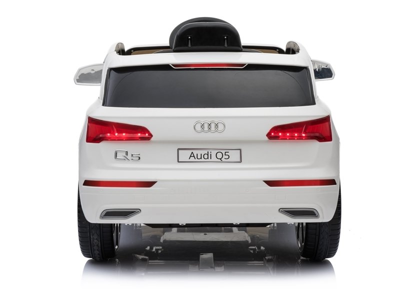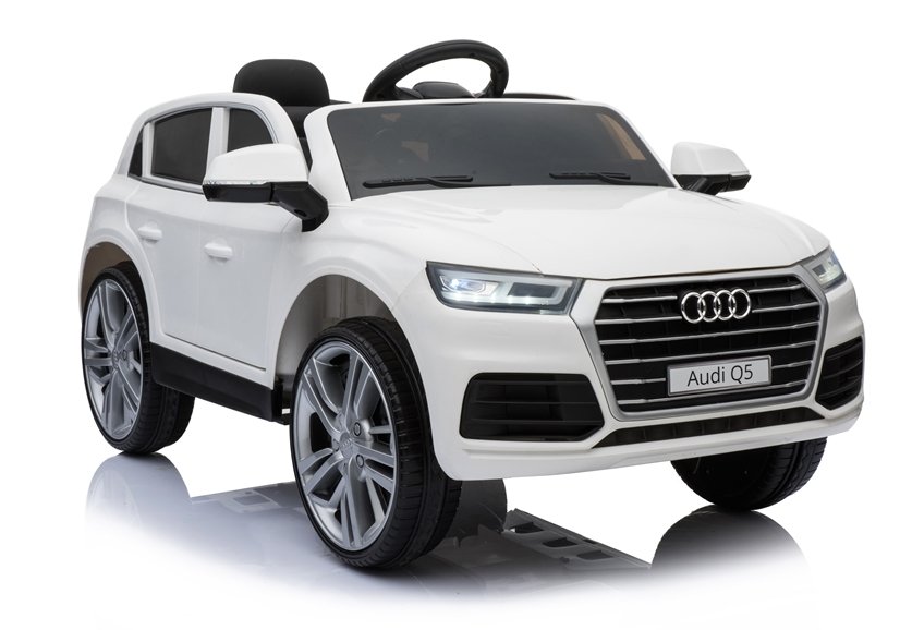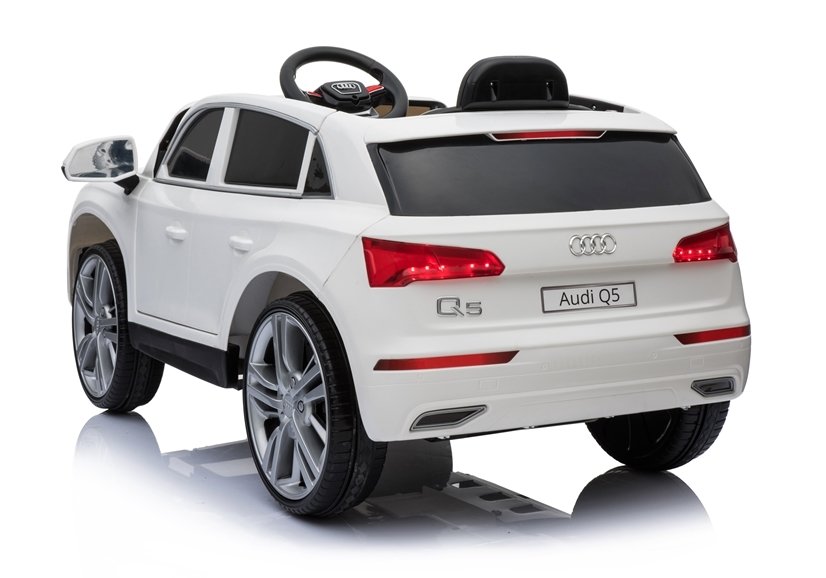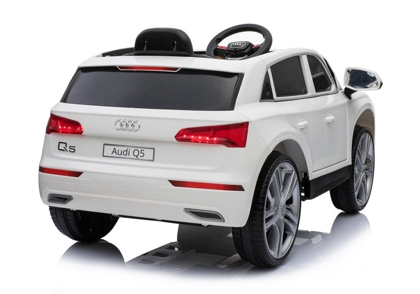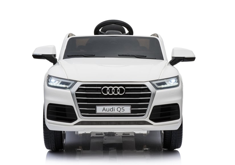 Audi Q5 w białym kolorze swą konstrukcją przyciągnie wzrok wszystkich przechodniów i fanów marki Audi, a przede wszystkim dzieci. Auto wyposażone jest w miękki, podwójny fotel o szerokości 40 cm, który wykonano z czarnej skóry ekologicznej. Kanapa połączona z zagłówkami oddalona jest od pedału gazu o 26 cm, co gwarantuje komfort i wygodę małemu kierowcy, tym samym nie sprawiając mu kłopotu podczas obsługi autka. Na trójramiennej kierownicy oznakowanej logo producenta umieszczono dwa przyciski, których delikatne wciśnięcie aktywuje dźwięk klaksonu i melodyjek. Jest to bardzo ciekawe rozwiązanie, które podnosi poziom bezpieczeństwa dziecka na drodze.