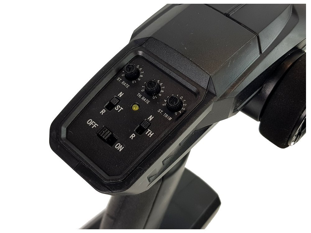 Samochód RC pozwala na kontrolę przepustnicy i prędkości. Dwa pokrętła umożliwiają ustawienie kąta skrętu. Natomiast przełącznik prędkości ustawiony zgodnie z ruchem wskazówek zegara zwiększa prędkość jazdy. Przełącznik prędkości ustawiony przeciwnie do ruchu wskazówek zegara zmniejsza prędkość jazdy. Dużą zaletą są metalowe amortyzatory wypełnione olejem oraz opony wysokiej wytrzymałości.