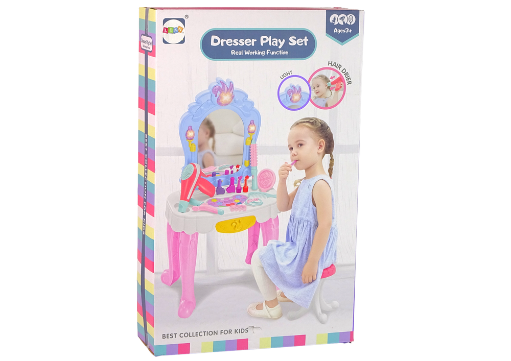 Wystarczy zasilić toaletkę bateriami i już można cieszyć się dodatkowymi światełkami i dźwiękami. U góry i na bokach toaletki znajdują się LED-y, które podświetlą lustro. W zabawce są także 3 podkłady muzyczne, towarzyszące podczas malowania. Do zestawu dołączono również działającą suszarkę, z lekkim i bezpiecznym nawiewem powietrza. Pod blatem toaletki kryje się wysuwana szufladka, w której można schować swoje kosmetyki i akcesoria.