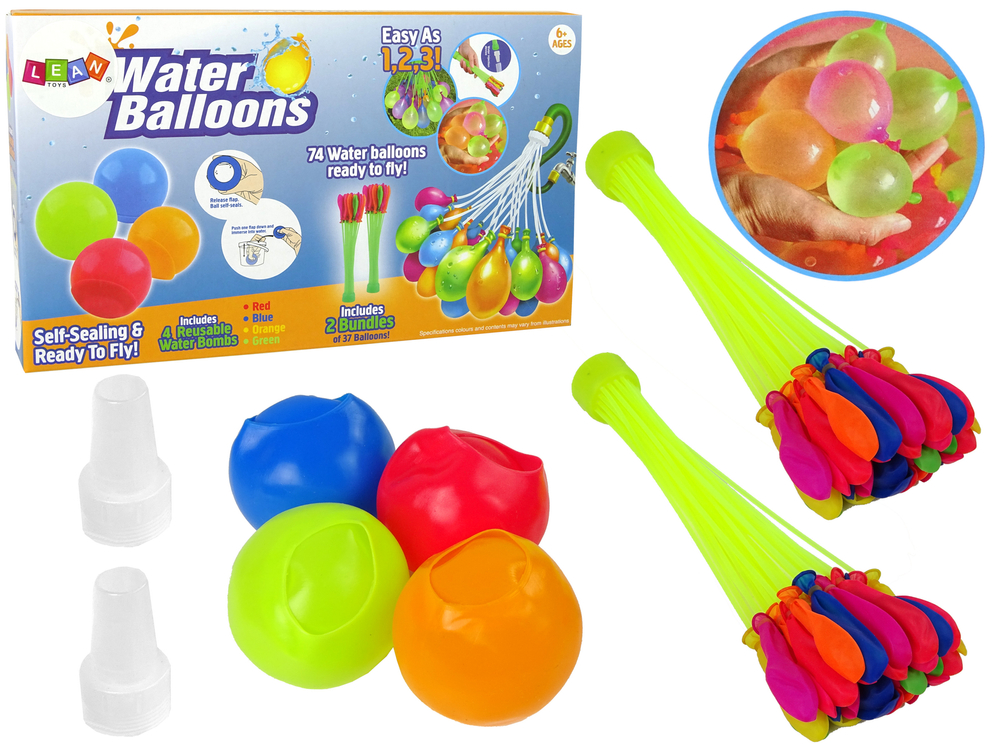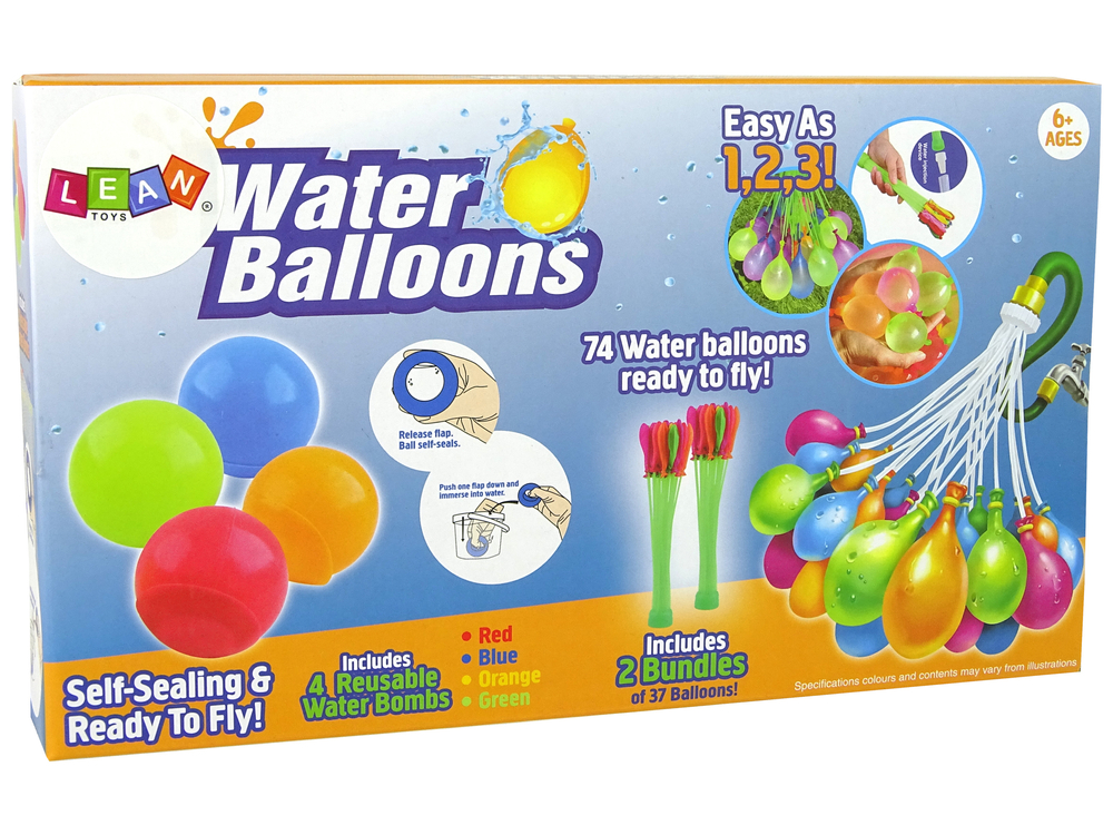 W zestawie znajdują się dwie wiązki po 37 balonów w różnych kolorach. Wystarczy podłączyć cały zestaw do kranu i czekać jak balony zostaną napełnione. W zestawie znajdziemy także 4 piłki w kolorze czerwonym, pomarańczowym, żółtym i niebieskim, które również można napełnić i będą działać jak bomby wodne. Zaletą jest to, że można używać ich wielokrotnie.
