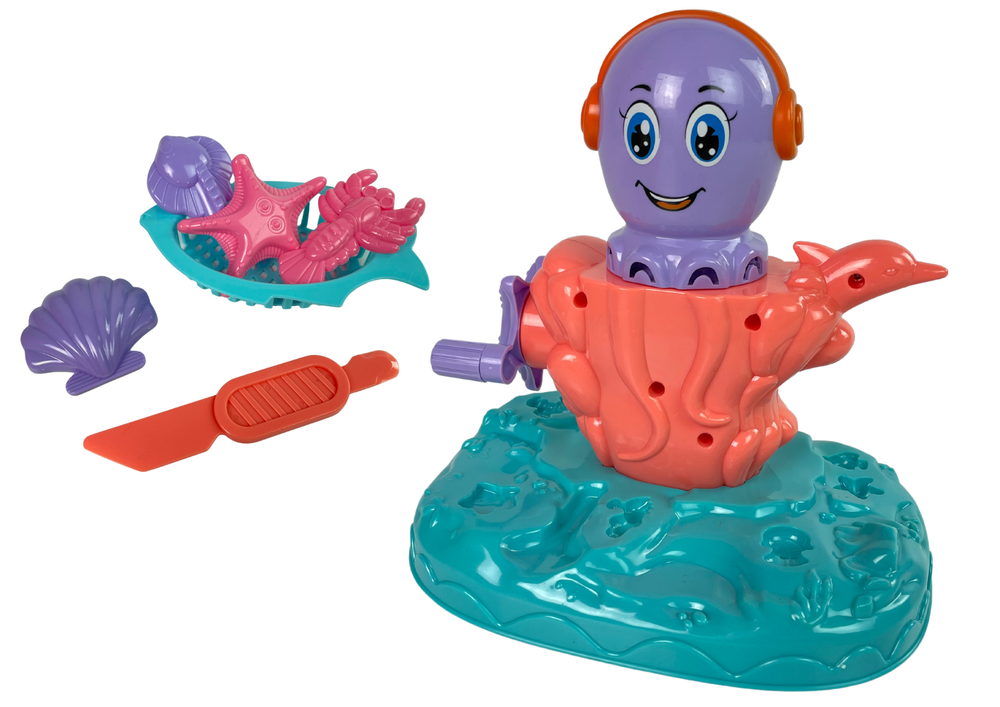 Ośmiornica nie ma macek? Trzeba je stworzyć z ciastoliny. Do środka wkładamy ulubioną kolor masy plastycznej, montujemy głowę ośmiornicy i kręcimy korbą. Z dołu zaczną wydobywać się długie macki!