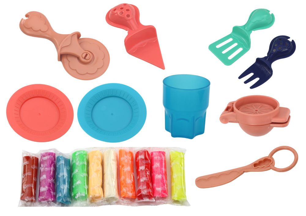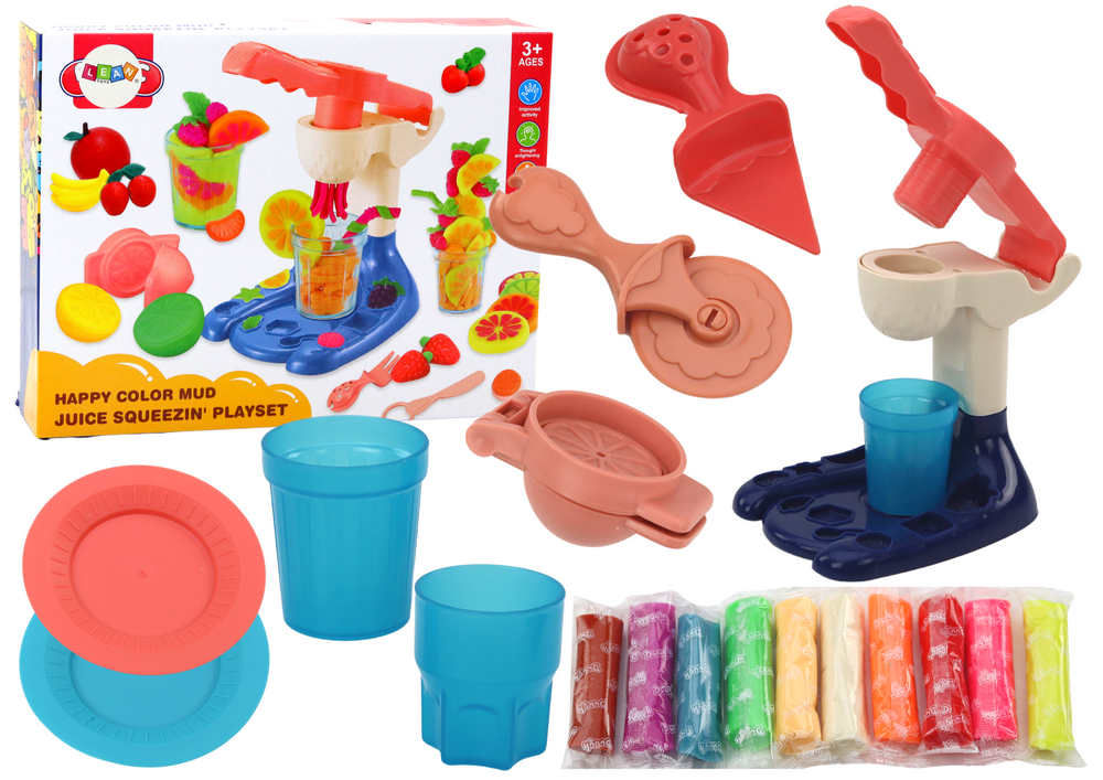 Za pomocą naszego wyciskacza do soków dziecko może wycisnąć kolorowe imitacje soków. W zestawie znajdują się wypustki co pozwala na tworzenie owoców w różnych kształtach. Dodatkowo masa plastyczna również znajduje się w różnych kolorach, dzięki temu dziecko może stworzyć różne wersje imitacji soków.