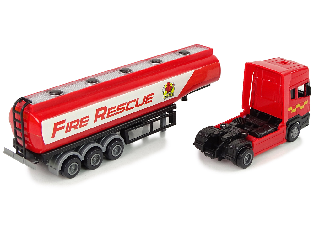 Ciężarówka ze względu na swoją prostą funkcjonalność, z pewnością zainteresuje i zachęci do samodzielnej zabawy, a dzięki niewielkiemu gabarytowi pojazdu, dziecko może takie autko zabrać ze sobą do przedszkola, do lekarza lub na wycieczkę rodzinną. Wygląda jak prawdziwy odpowiednik, który jeździ po drogach i każdy mały kolekcjoner może poszerzyć swoją kolekcję. Całość ma kolor czerwony z białymi napisami FIRE RESCUE. Cysterną można skręcać na boki, dlatego ma możliwość dużego manewrowania.