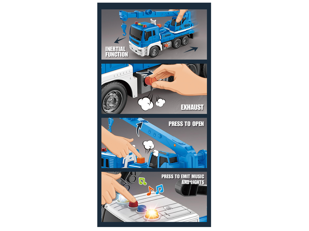 Pojazd posiada frykcyjny napęd tylnej osi na popych, wystarczy nacisnąć na tył, puścić do przodu i cieszyć się prędkością. Aby unieść dźwig należy naciskać pomarańczowy przycisk na naczepie, długie ramie będzie miało większy zasięg. Aby wróciło do poprzedniego stanu, należy pociągnąć za drążek.