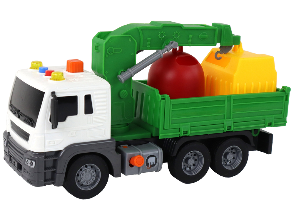 Dodatkową atrakcją jest dźwig umieszczony na dachu ciężarówki. Po wciśnięciu pomarańczowego przycisku, rama dźwigu unosi się, co dodaje element interakcji i kreatywności do zabawy. Dziecko może podnosić i opuszczać kontenery, odgrywając scenki zbierania i segregowania śmieci.