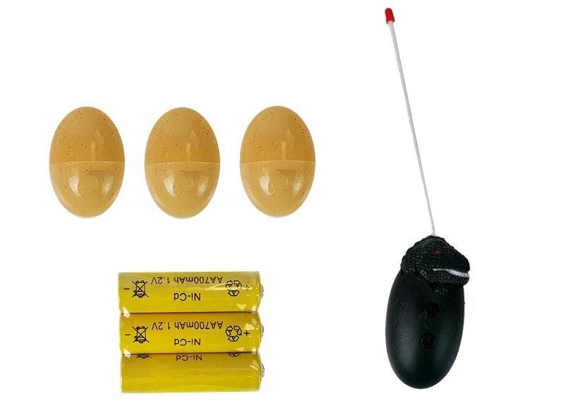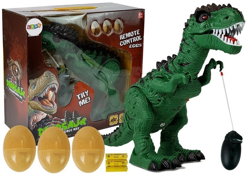Tyranozaur Rex posiada dużą czaszkę, a także masywną, muskularną budowę, wielkie białe zęby. Cała długość dinozaura to aż 54 cm! Jego kolorystyka zielona z elementami czarnego i struktura idealnie przypomina prawdziwego dinozaura. Dodatkowego efektu daje świecące łuski na głowie dinozaura w różnych kolorach, zamontowany projektor ze zdjęciem prawdziwego tyranozaura daje odczucie jeszcze bardziej realistyczne. Produkt został wyposażony w głośnik, przez który słychać odgłosy imitujące dźwięki wydawane przez dinozaury. Pilot do sterowania przedstawiający dinozaura wykluwającego się z jaja, ciekawie wygląda i prezentuje się na półce małego odkrywcy prehistorycznych stworzeń. Podczas sterowania dinozaur porusza się w przód, rusza głową, paszczą i łapami. Następną zaletą to znoszenie jaj! Na grzbiecie znajduje się otwór, gdzie wrzucamy jaja, a one wylatują od spodu, imitując prawdziwe znoszenie jaj. W zestawie 3 sztuki. Twój dinozaur może powiększyć rodzinę! Zabawa potęguję niecodzienne wrażenia oraz na pewno zainteresuje malucha do pogłębiania wiedzy na temat tych wielkich gadów.