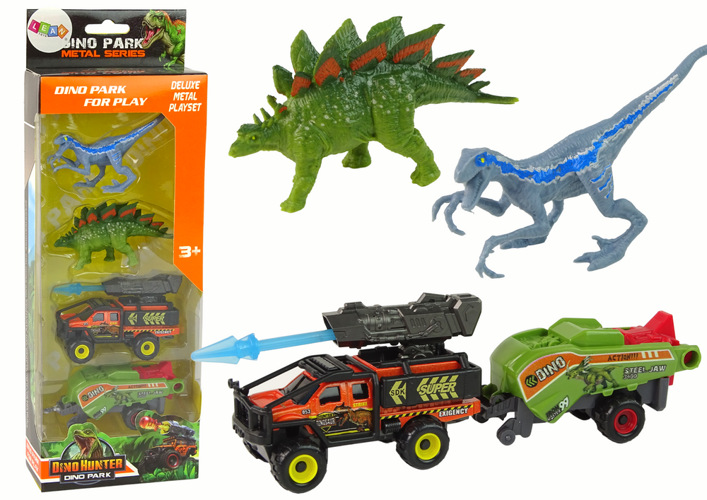 Samochód posiada również przyczepę, która jest doskonałym uzupełnieniem zestawu i umożliwia transport złapanych dinozaurów.