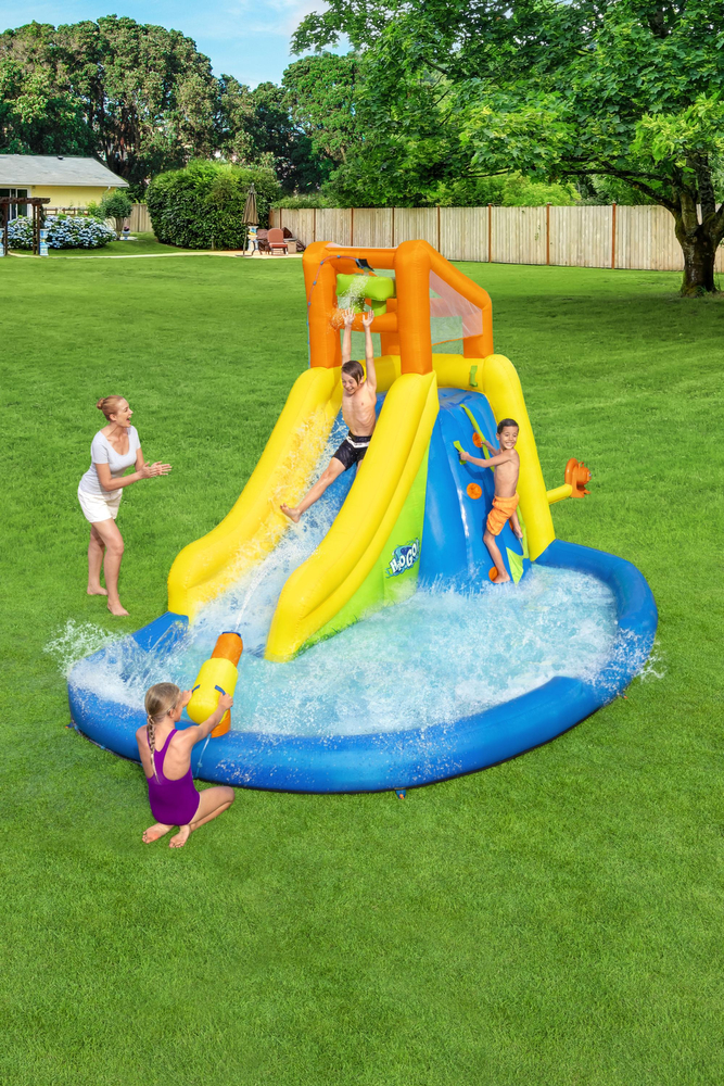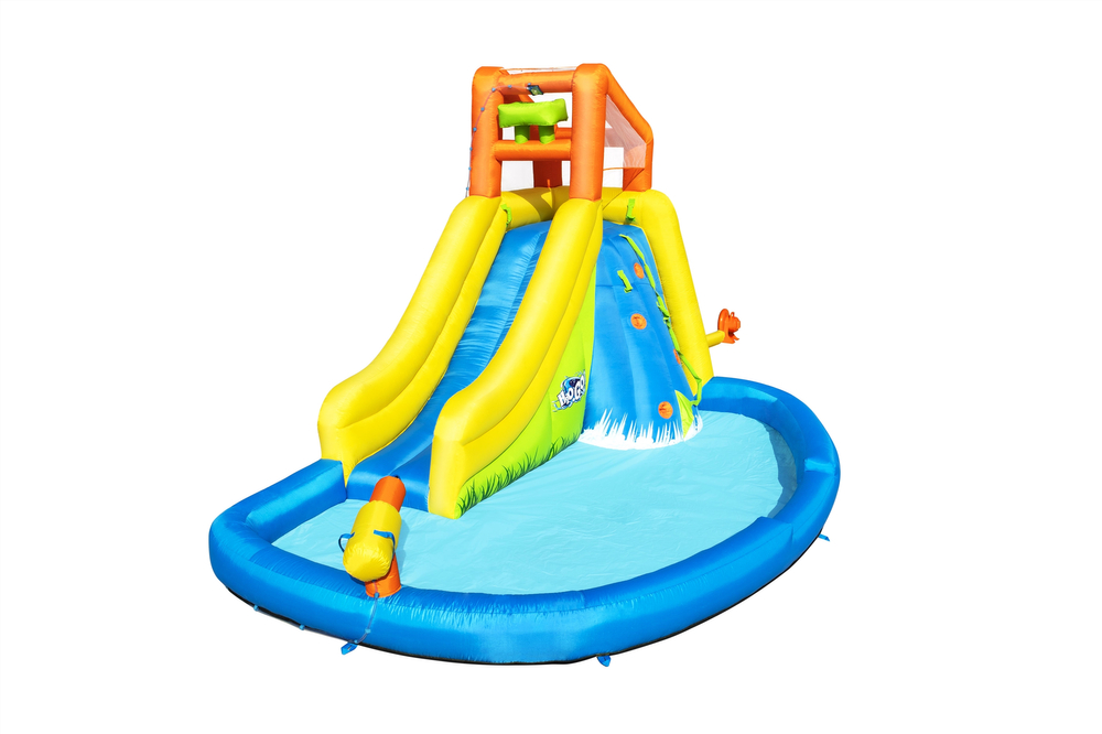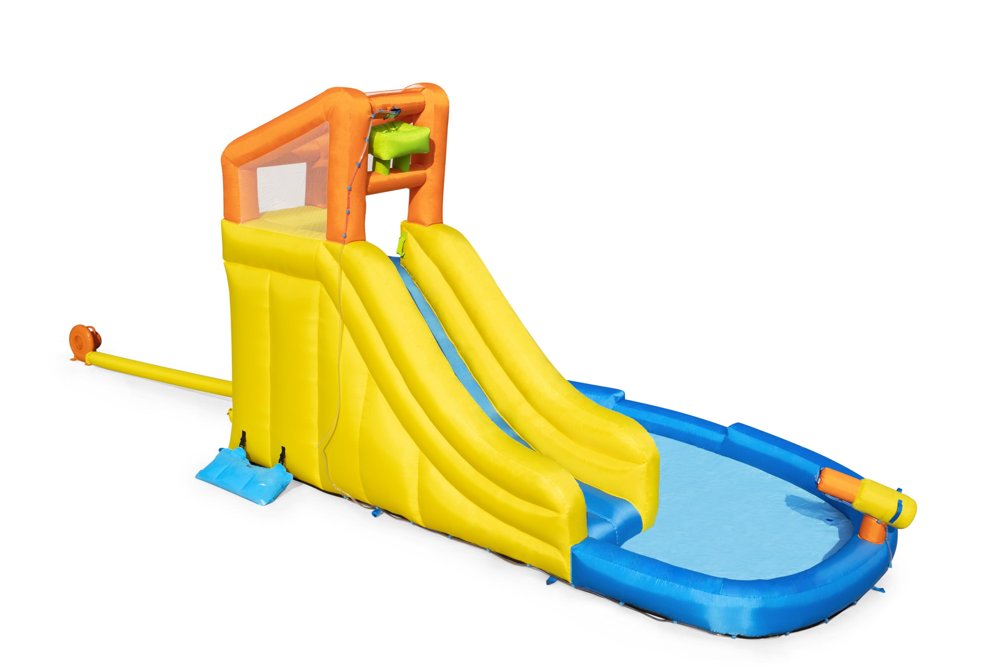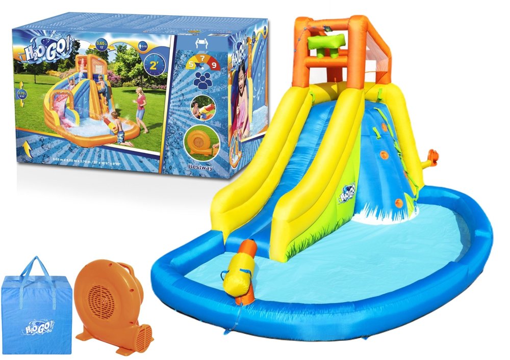Nadmuchiwany park wodny to wypełniona zabawą nadmuchiwana przestrzeń do wspinania się, zjeżdżania i odkrywania. Ściany wspinaczkowej Twoje dziecko będzie mogło wykorzystać aby dostać się do wieży z zamkniętymi ścianami z siatki. Duża zakrzywiona zjeżdżalnia, dzięki dozownikowi wody jest śliska co ułatwia zjazd i dodaje dodatkowej frajdy Rodzice i dzieci pokochają duży basen do ochłody. Wbudowanym spryskiwaczem można wycelować i namoczyć znajomych. Dmuchany plac zabaw może pomieścić jednocześnie do pięciu graczy. Jest wykonany z podwójnie szytego materiału, który zwiększa rozciągliwość, wytrzymałość i trwałość. Materiał zapewnia odporność na zużycie i warunki atmosferyczne. Można szybko spuścić za pomocą łatwo dostępnego wbudowanego zaworu spustowego. Ten nadmuchiwany park wodny jest wyposażony we własną torbę do przechowywania, dzięki czemu całą zabawę można łatwo spakować na kolejny dzień.