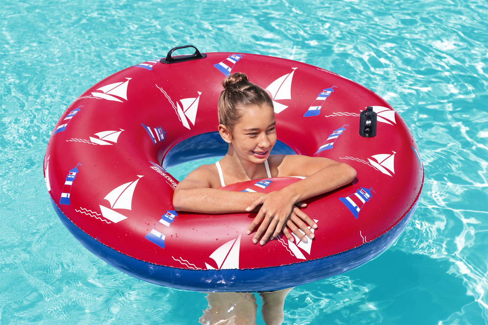 Wybierając się nad wodę warto zabrać ze sobą wszystkie niezbędne akcesoria basenowe, świetnym dodatkiem do wodnego relaksu i zabawy będzie również dmuchane koło do pływania. Koło przeznaczone jest dla dzieci od 12 roku życia oraz wszystkich dorosłych. Jego średnica wynosi 119 cm. Koło jest wygodne i stabilne na wodzie. Dodatkowy komfort z użytkowania zapewniają wygodne uchwyty. Koło wykonane jest z wytrzymałego materiału PVC odpornego na uszkodzenia i działanie promieni słonecznych.