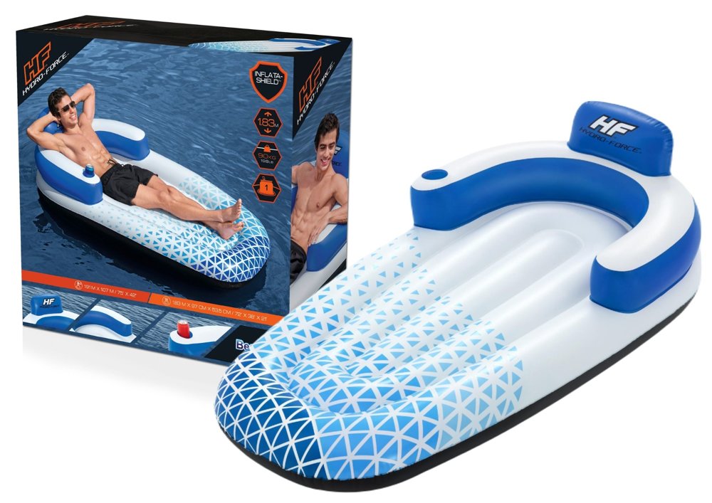 Bardzo wygodny i praktyczny materac przyda się wszystkim miłośnikom zarówno wody jak i spędzania czasu na plaży. Materac może służyć zarówno jako klasyczny materac do pływania jak i do opalania. Dodatkowym atutem, który zapewni Ci wygodę i relaks są podłokietniki i dmuchane oparcie. Klasyczny niebiesko biały kolor pewnością przypadnie Ci do gustu. Materac zawiera również otwór na napój dzięki czemu nie będziesz musiał wychodzić z wody aby móc napić się swojego ulubionego napoju.