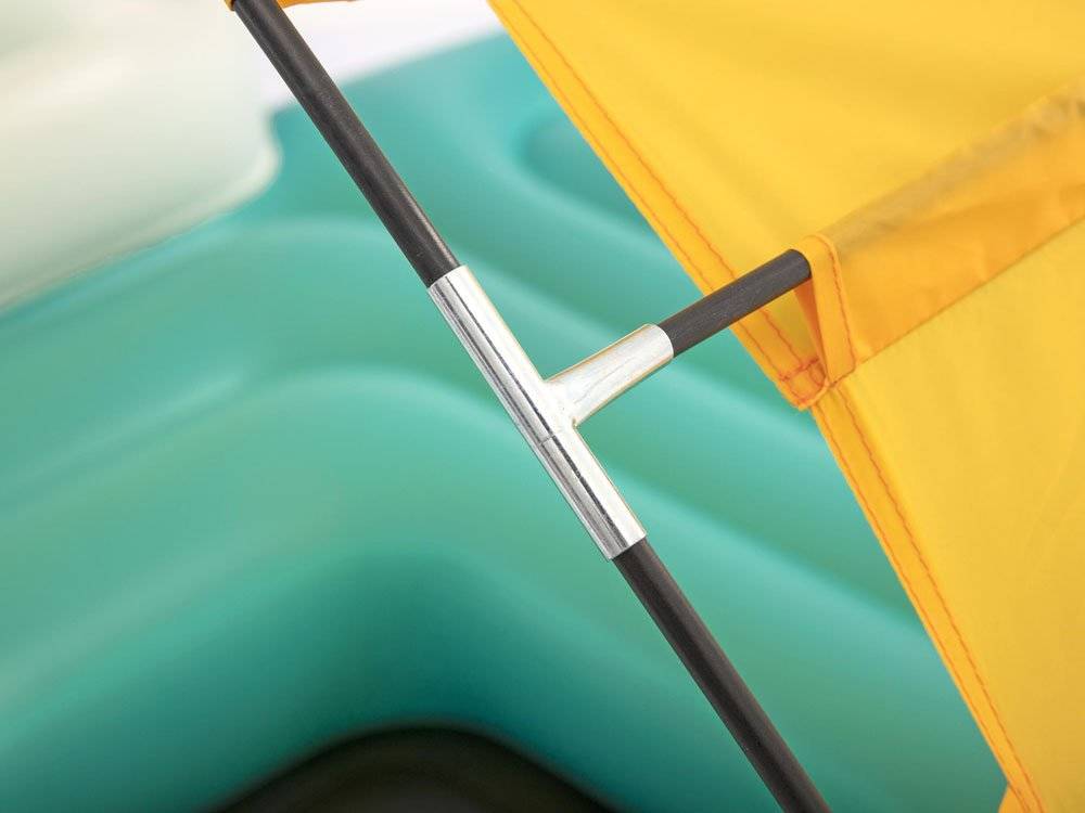 System, który jest zawarty w materacu zapewnia jego odpowiednią sprężystość. Żółty daszek, który chroni od promieni słonecznych w łatwy sposób można zdemontować usuwając cień dzięki czemu materac świetnie sprawdzi się również przy opalaniu. Nadmuchiwane oparcia zapewnią Ci wygodę a holdery na picie ułatwia szybki dostęp do Twoich ulubionych napojów. W materacu zawarte są również uchwyty i linki, które ułatwiają przetransportowanie materaca na brzeg. W środku materaca znajduję się również mały basenik do chłodzenia nóg. Do zestawu dołączona jest również łatka naprawcza. Materac wytworzony jest z wytrzymałego materiału jakim jest winyl.