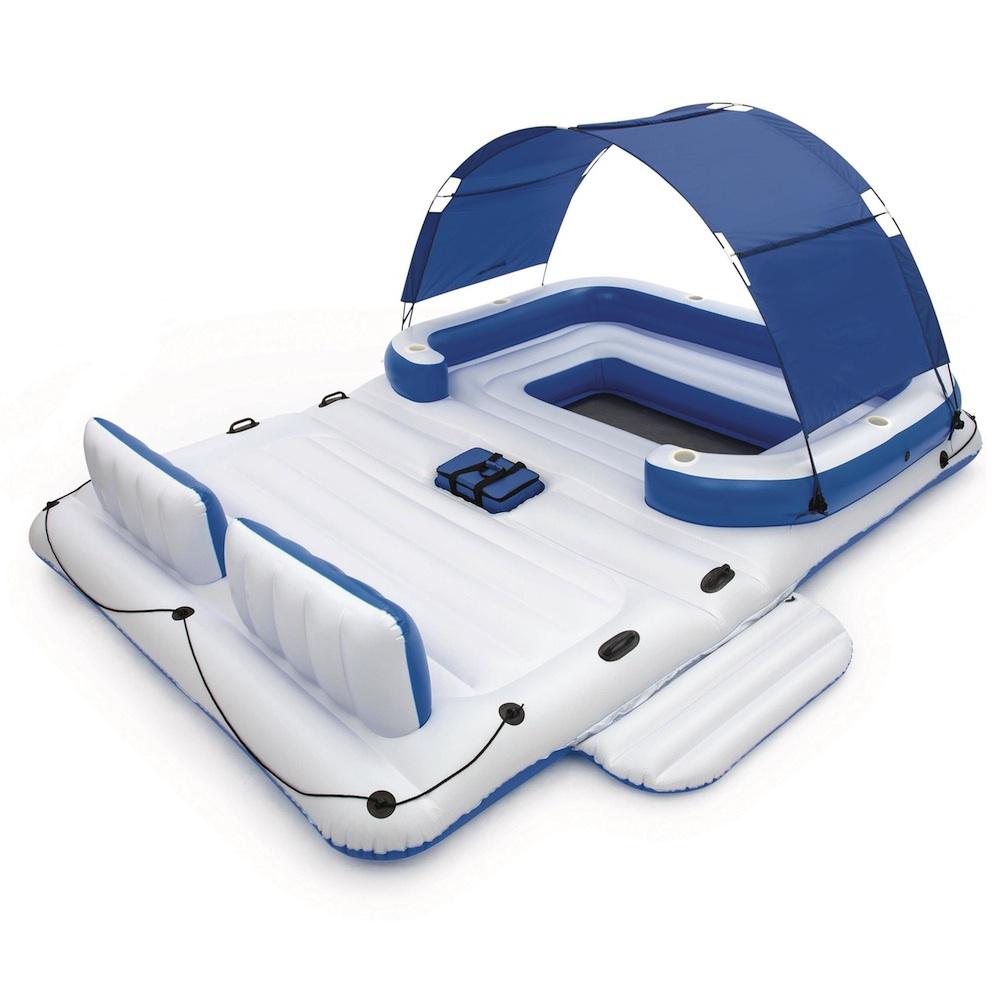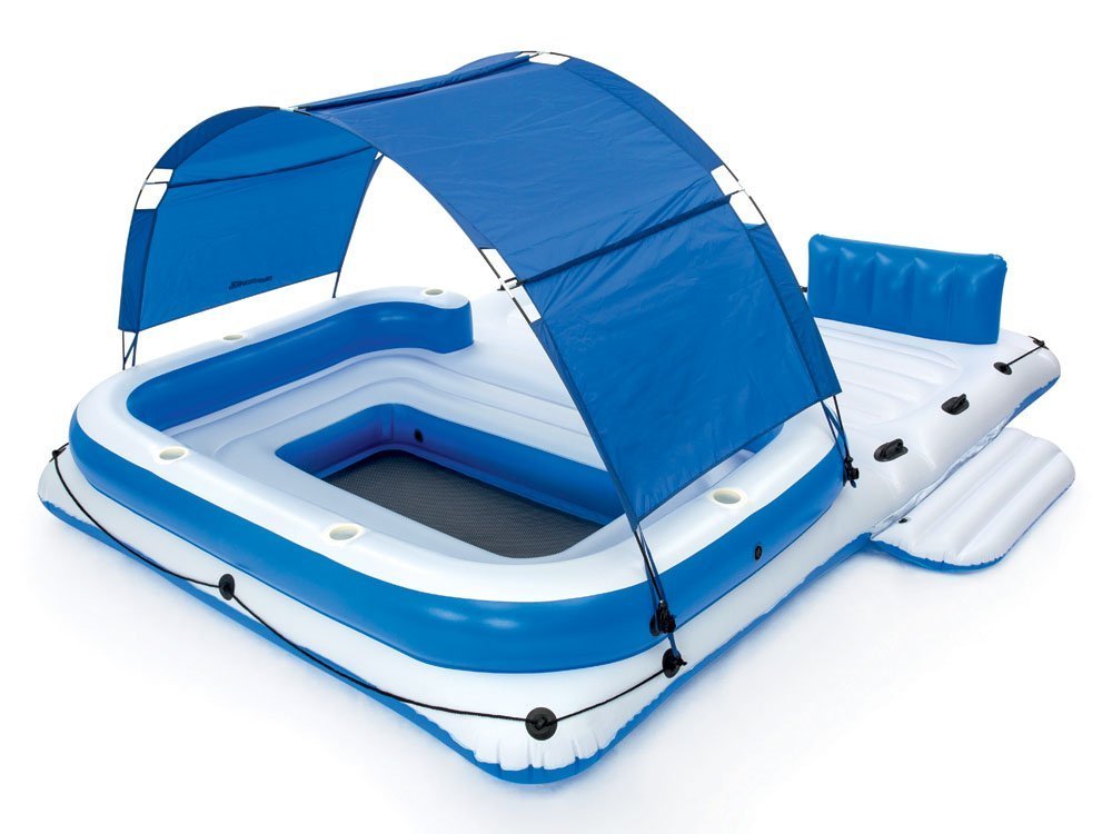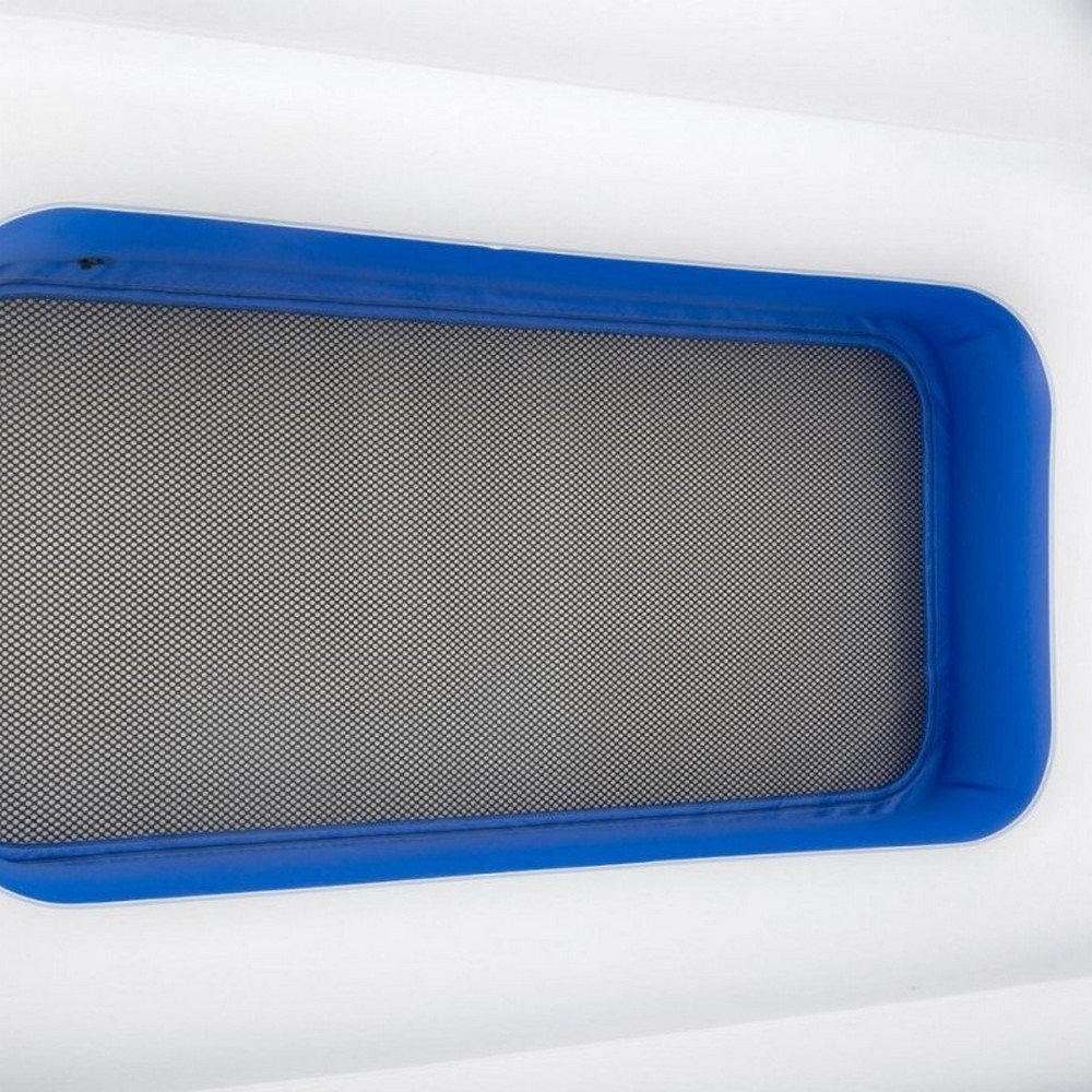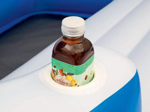 System, który jest zawarty w materacu zapewnia jego odpowiednią sprężystość. Niebieski daszek, który chroni od promieni słonecznych w łatwy sposób można zdemontować usuwając cień dzięki czemu materac świetnie sprawdzi się również przy opalaniu. Nadmuchiwane oparcia zapewnią Ci wygodę a holdery na picie ułatwia szybki dostęp do Twoich ulubionych napojów. W materacu zawarte są również uchwyty i linki, które ułatwiają przetransportowanie materaca na brzeg. W środku materaca znajduję się również mały basenik do chłodzenia nóg. Dołączona do zestawu torba termiczna umożliwi schłodzenie napojów a wbudowane na na nią miejsce sprawi, żę będzie ona stabilna i nie będzie przeszkadzała w wypoczynku. Do zestawu dołączona jest również łatka naprawcza. Materac wytworzony jest z wytrzymałego materiału jakim jest winyl.