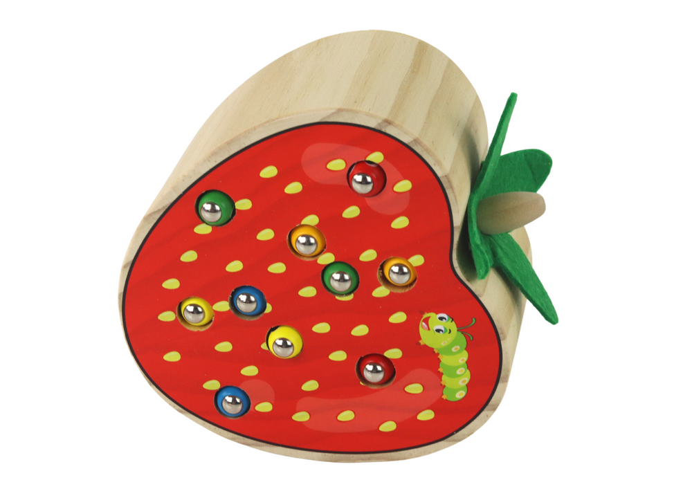Gra skupia się na fascynującym zadaniu polegającym na chwytaniu drewnianym kijkiem z magnesem uroczych robaczków, które sprytnie ukryte są w malowniczych otworach w drewnianej truskawce. Następnie maluch ma zadanie precyzyjnie umieścić je z powrotem. To wyzwanie, które nie tylko rozwija skupienie uwagi, ale również doskonali sprawność manualną, koordynację ruchową i zdolności motoryczne.
