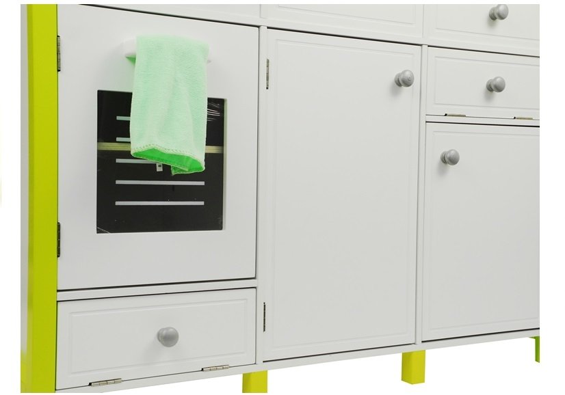 Konstrukcja biało-zielonej kuchni dziecięcej składa się z szerokiego blatu z jasnego drewna, na którym umieszczono czarną płytę z czterema palnikami, zlew z kranem i obrotowymi kurkami, a także miejsce robocze do przygotowywania posiłków. Na ściance kuchenki umieszczono drążek z wieszakami, a także pionowe i poziome szafeczki na przeróżne dodatki. Pod blatem znajdują się specjalne pokrętła, będące imitacją kurków kuchenki gazowej, oraz liczne szafki, pozwalające na przechowywanie garnków i produktów spożywczych używanych podczas zabawy.