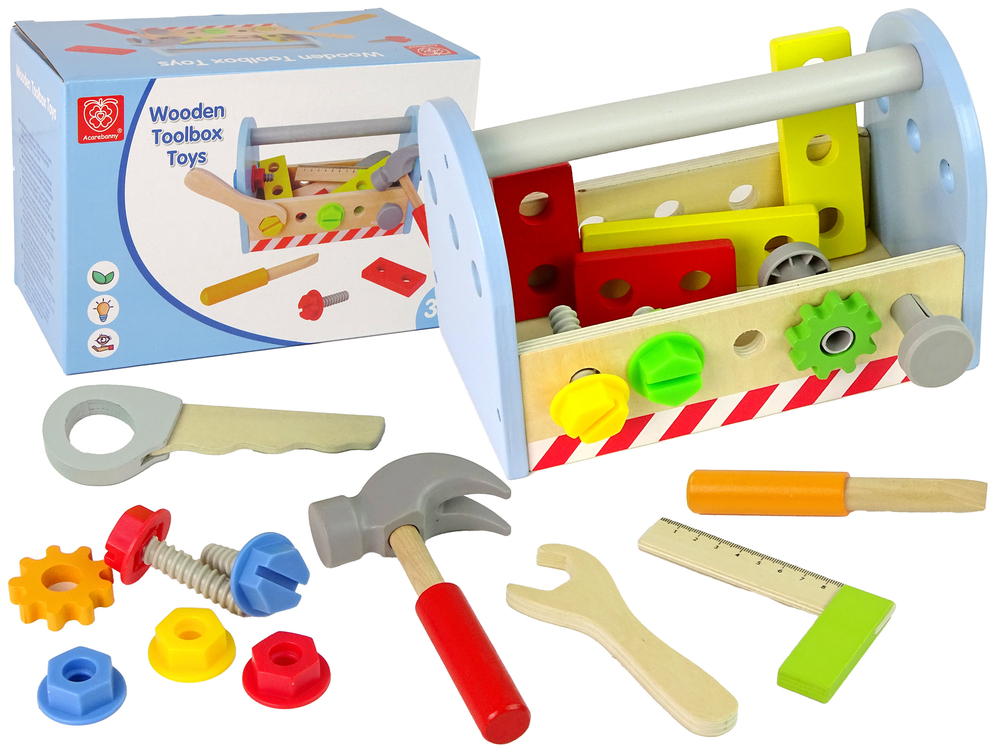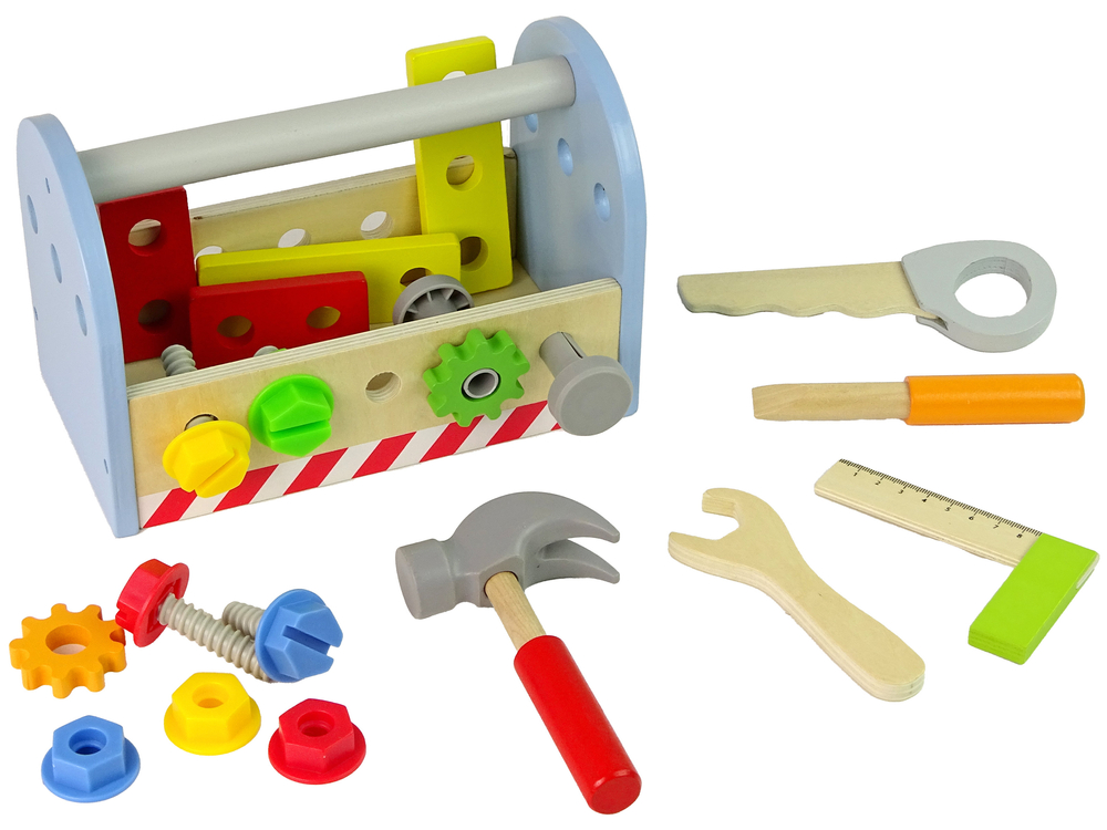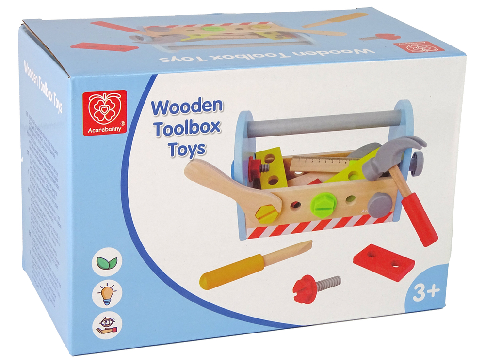 Zabawka jest łatwa w przenoszeniu, dzięki podłużnemu uchwytowi. Cała skrzynka ma kolor niebieski z naturalnym drewnem. Wydrążone otwory służą do wkręcania i rozkręcania śrubek. Narzędzia mają różnokolorowe końcówki. Czas rozpocząć wspólną pracę i zabawę w garażu bądź ogródku. Majsterkowanie nie będzie już obce. Wyobraźnia pobudzi do działania i poznawania nowych rzeczy.