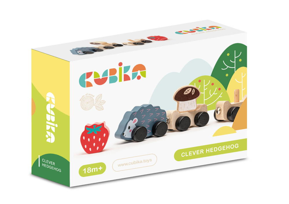 Ten wspaniały Jeż to niesamowita drewniana zabawka. W skład zestawu wchodzi jeż, dwie przyczepy, truskawka i grzybek. Elementy drewnianej zabawki możemy wprawiać w ruch. Zabawka umożliwia dziecku przewóz truskawki i grzybka na przyczepie.