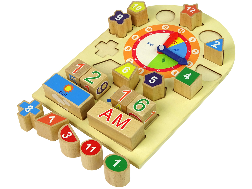 Dzięki klockom dziecko będzie mogło poznawać kształty, liczby oraz kolory. W zestawie znajduje się 12 klocków z liczbami wskazujące godziny, każdy z nich pasuje tylko do jednego z otworów w kostce edukacyjnej. Dziecko będzie miało za zadanie wyszukanie takich samych kształtów i umieszczenie w nich wszystkich klocków na zasadzie sortera. Zegar natomiast nauczy malucha rozpoznawania godzin. Po odczytaniu poniżej ma możliwość ułożeniu godziny z 4 klocków z liczbami. Dwa podłużne klocki pokazują porę dnia i pogodę. Mały edukacyjny zegar pomoże w nauce Twojemu dziecku.