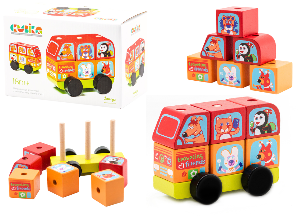 Zabawka składa się z ruchomych kółek i 6 klocków, które mocuje się do podstawy. Koła obracają się, dzięki czemu dziecko może naśladować podróż autobusu.