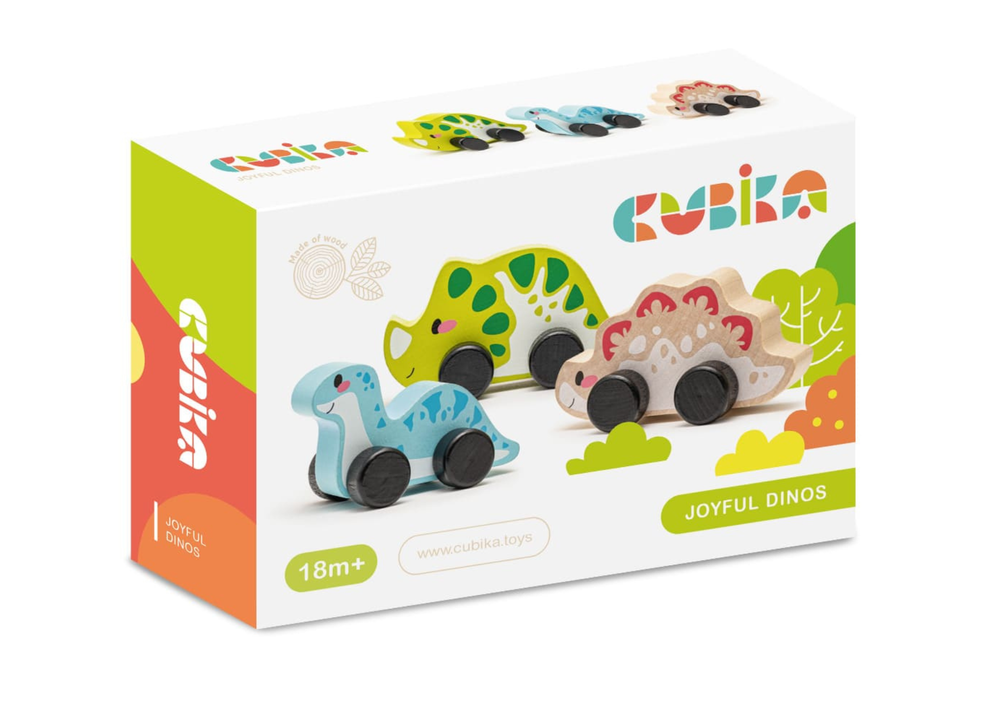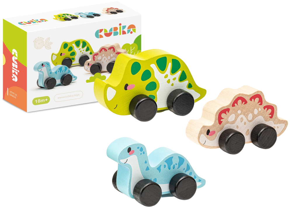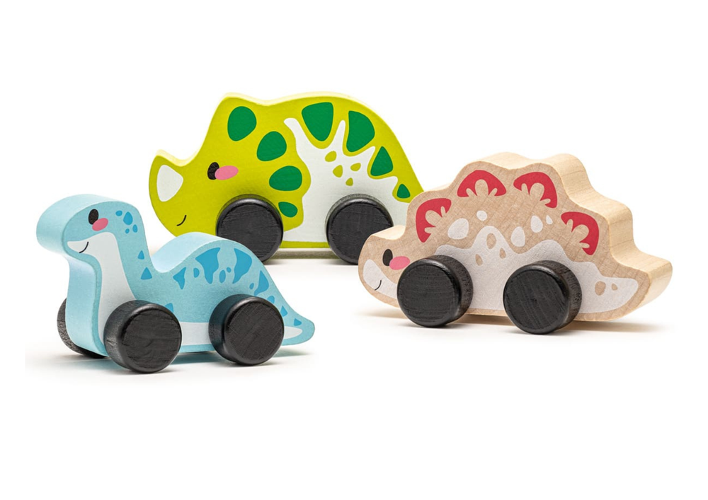 Zestaw składa się z trzech, drewnianych figurek dinozaurów na kółkach, które idealnie leżą w dłoni dziecka i z łatwością dają się przesuwać po gładkich powierzchniach.