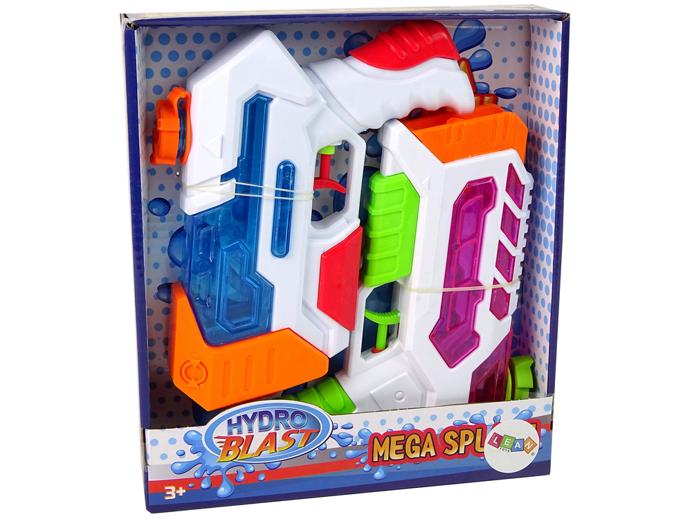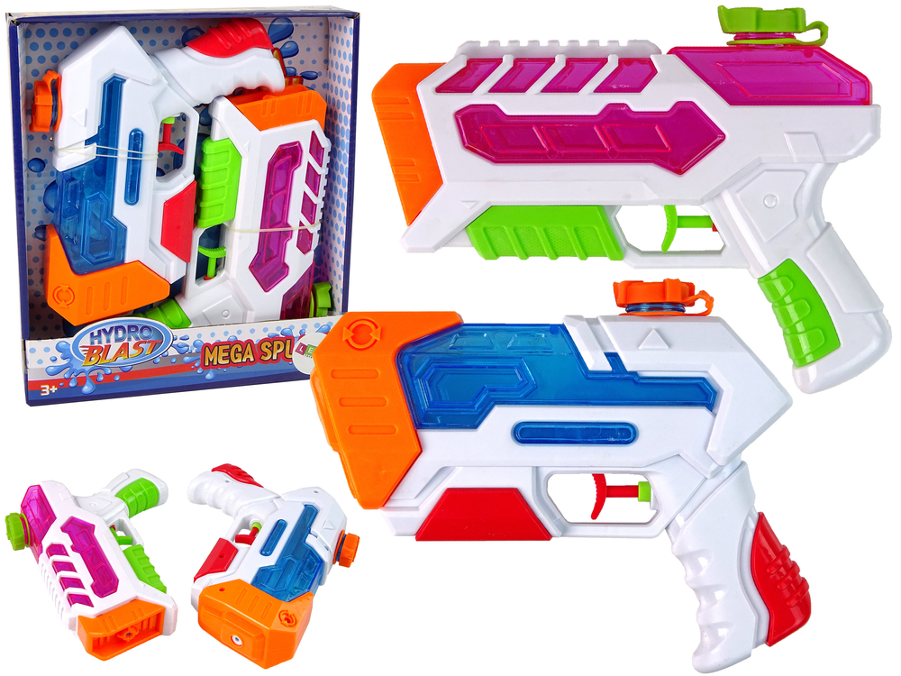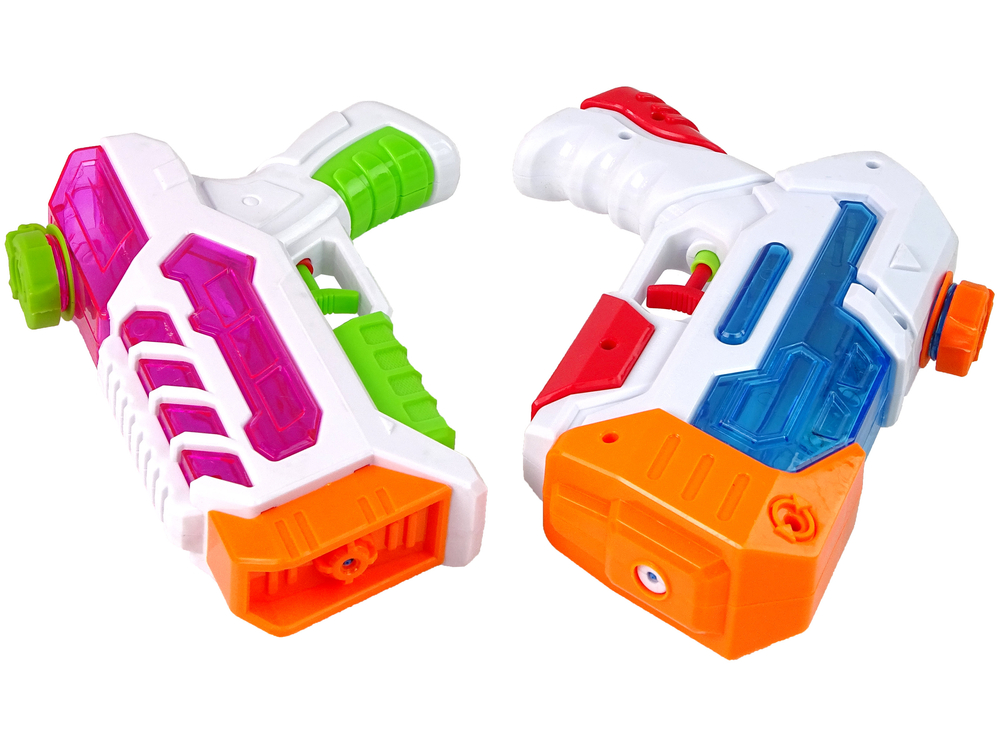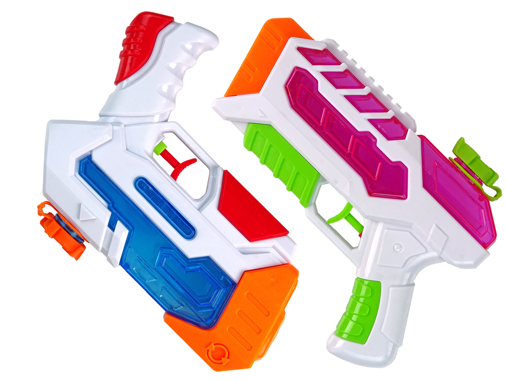 Dwa pistolety są całkowicie bezpieczne dla maluchów, nie mają ostrych zakończeń. Naciskając spust, z lufy wylatuje strumień wody. Zbiornik pomieści około 200 ml wody. Zestaw do zabawy w dwójkę! Różne kolory pozwolą rozróżnić, który pistolet należy do kogo.