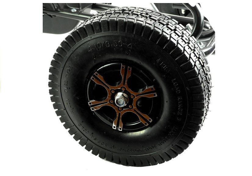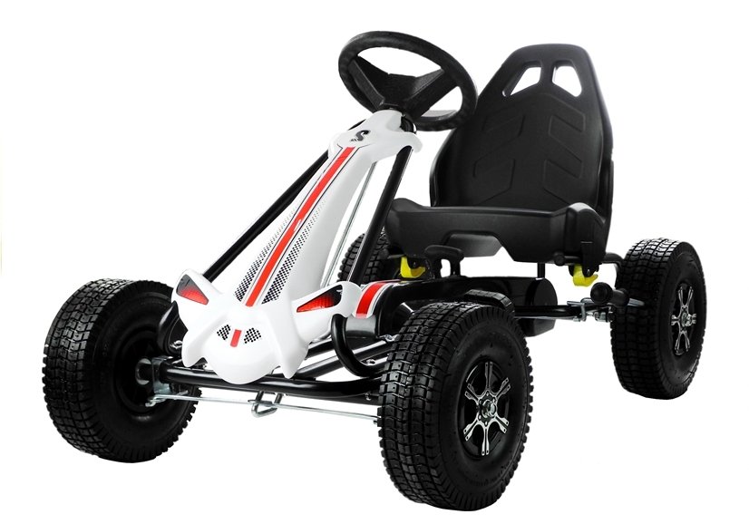 Ulokowanie białego gokarta na pompowanych kołach sprawia, że kierowca może jeździć swym dwuśladem po różnych nawierzchniach. Za komfort jazdy odpowiada także czarny, szeroki fotel z opieraniem, którego odległość od pedałów można regulować, a także wygodna kierownica o ergonomicznym kształcie. Udogodnienia te w połączeniu z szerokimi na 8 cm kołami sprawiają, że prezentowany gokart sprosta wszystkim warunkom — sprawdźcie to sami!