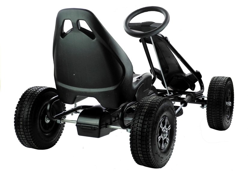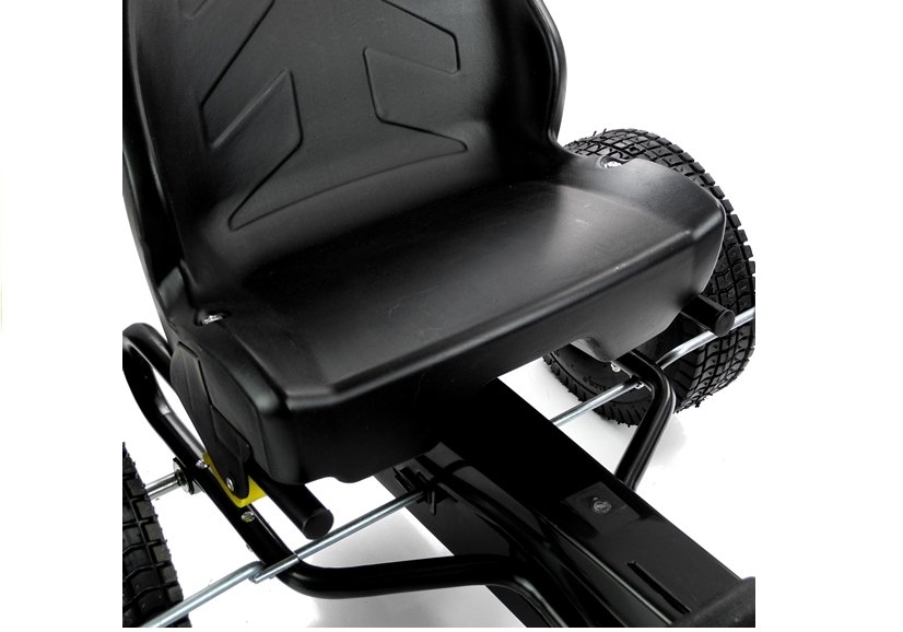 Ulokowanie czarnego gokarta Monster na pompowanych kołach sprawia, że kierowca może jeździć swym dwuśladem po różnych nawierzchniach. Za komfort jazdy odpowiada także czarny, szeroki fotel z opieraniem, którego odległość od pedałów można samodzielnie regulować, a także wygodna kierownica o ergonomicznym kształcie. Udogodnienia te w połączeniu z szerokimi na 8 cm kołami sprawiają, że prezentowany gokart Monster sprosta wszystkim wymaganiom — sprawdźcie to sami!