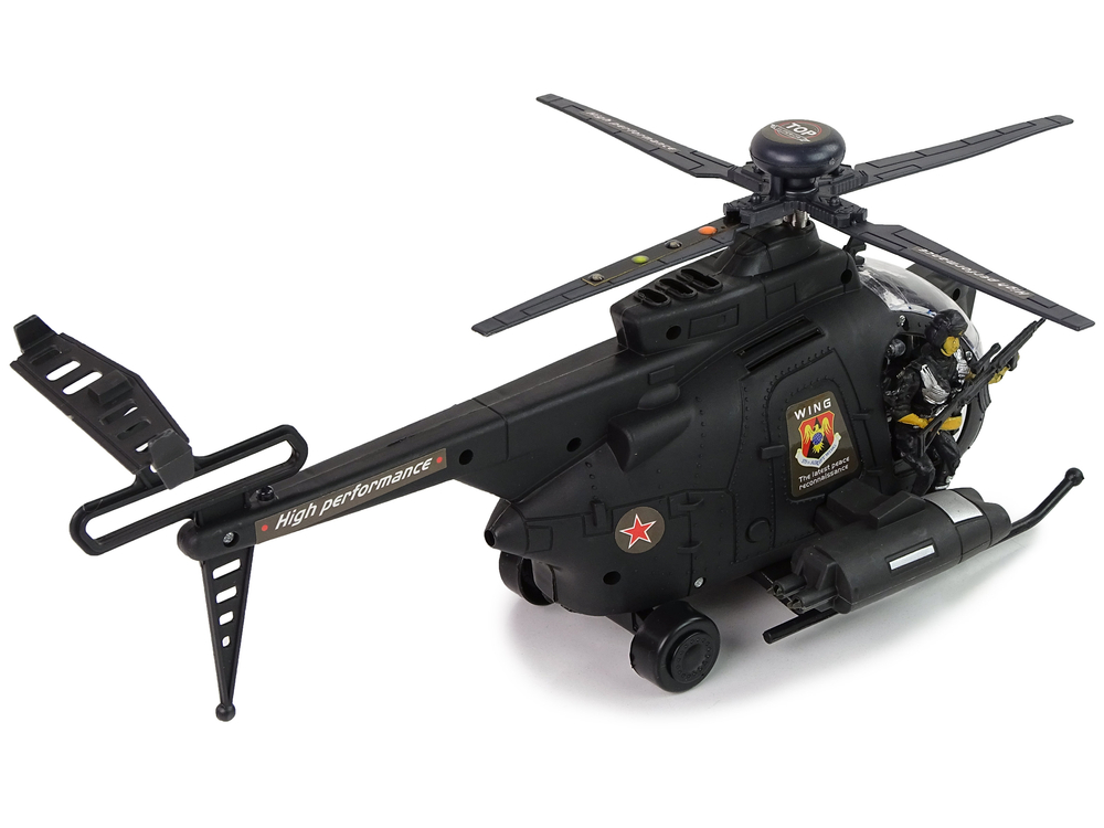 Helikopter utrzymany jest w czarnych barwach, szerokie podwozie ułatwi lądowanie. Szeroko rozstawione skrzydła z kolorowymi światłami i dźwięki w tle sprawią, że zabawa będzie realistyczna. Dwóch komandosów, jeden za sterami, drugi gotowy do strzału! Pod spodem helikoptera zamontowane są kółka, dzięki którym helikopter się porusza.