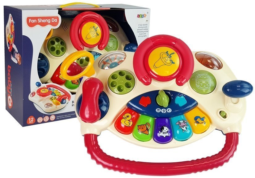 Ta muzyczna zabawka składa się z obrotowej kierownicy o ergonomicznym kształcie, doskonale leżącej w małych rączkach, a także guzików muzycznych i obrotowego lusterka. Ponadto maluszek odnajdzie w niej kluczyk oraz guziki uruchamiające głos silnika. Panel edukacyjny posiada certyfikat CE, co stanowi o spełnieniu wszystkich wymaganych wymogów. By maluszek mógł korzystać ze wszystkich atrakcji, jakie zapewnia zabawka, należy zasilić ją 3 sztukami baterii AA 1.5 V.