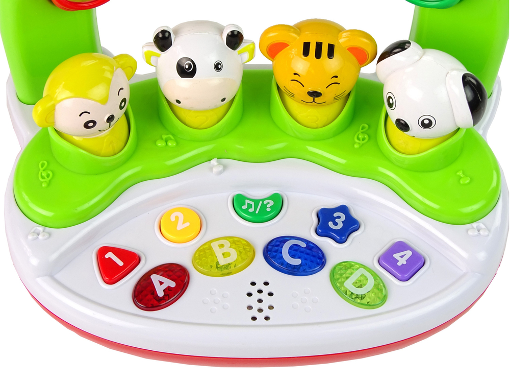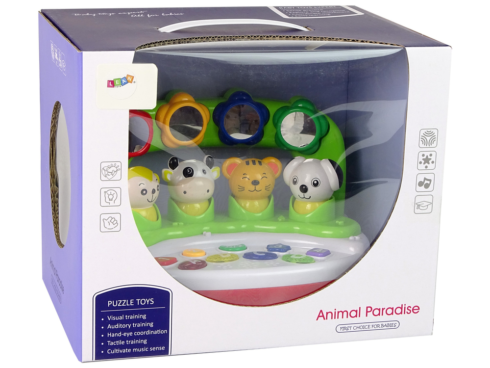 Zabawa ma formę panelu edukacyjnego. Na zabawce przedstawione są także zwierzątka, funkcje głosowe dadzą poznać odgłosy zwierząt i ich nazwy po angielski. Wiele wspaniałej zabawy i nauki języka angielskiego. Funkcje dźwiękowe uruchamiają się poprzez naciśnięcie, co ćwiczy precyzję i zdolności manualne. Kolorowe diody stymulują zmysł wzroku i zachęcają do zabawy.