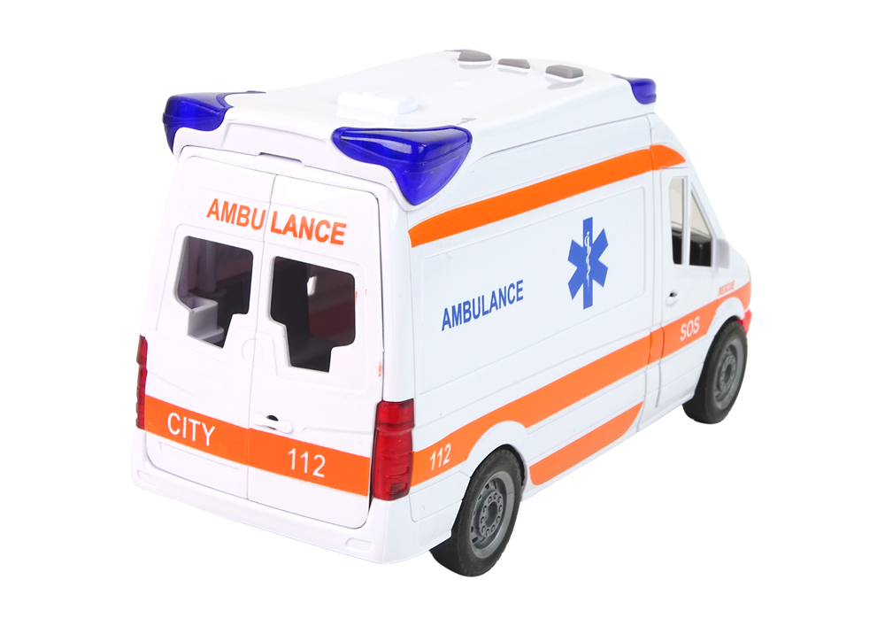 Samochód ambulans z syreną i niebieskim kogutami to propozycja dla każdego młodego kierowcy służby zdrowia. Autko wykonane w całości z plastiku, w kolorystyce odpowiedniej dla ambulansów. Pojazd ma naciąg na przednie koła, dzięki czemu jeździ samodzielnie. Efekt dźwiękowy i świetlny uruchamia się za pomocą przycisków znajdujących się na dachu.