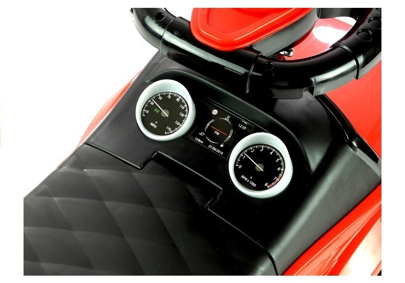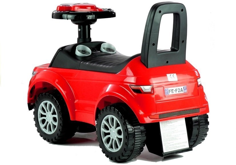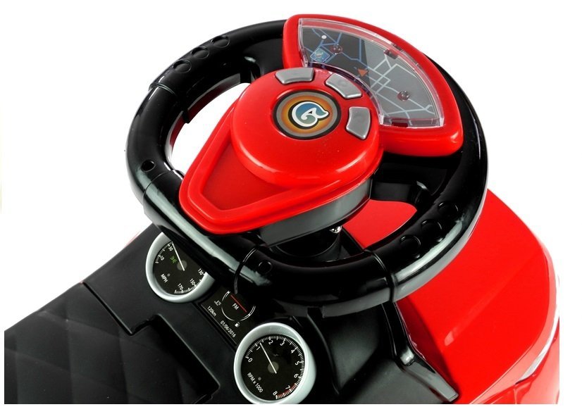 Czerwono-czarny jeździk został wykonany z bardzo lekkiej konstrukcji, dzięki czemu jest łatwy w manewrowaniu i prowadzeniu. W dużym, a przede wszystkim wygodnym siedzisku, znajduje się sprytny schowek na drobiazgi, na przykład zabawki, które maluch chce zabrać ze sobą na spacer. Praktyczne oparcie dołączone do siedziska sprawi, że dziecko będzie zachowywać prostą postawę podczas zabawy, a ponadto czuć się bardzo komfortowo. Duże, szerokie koła jeździka umożliwią wybieranie różnych podłóż do zabawy, dzięki czemu samochodzik sprawdzi się zarówno w domu, jak i na podwórku. Maksymalne obciążenie tego jeździka to 27 kg, dlatego z pewnością posłuży Twojemu maluchowi przez długi czas.