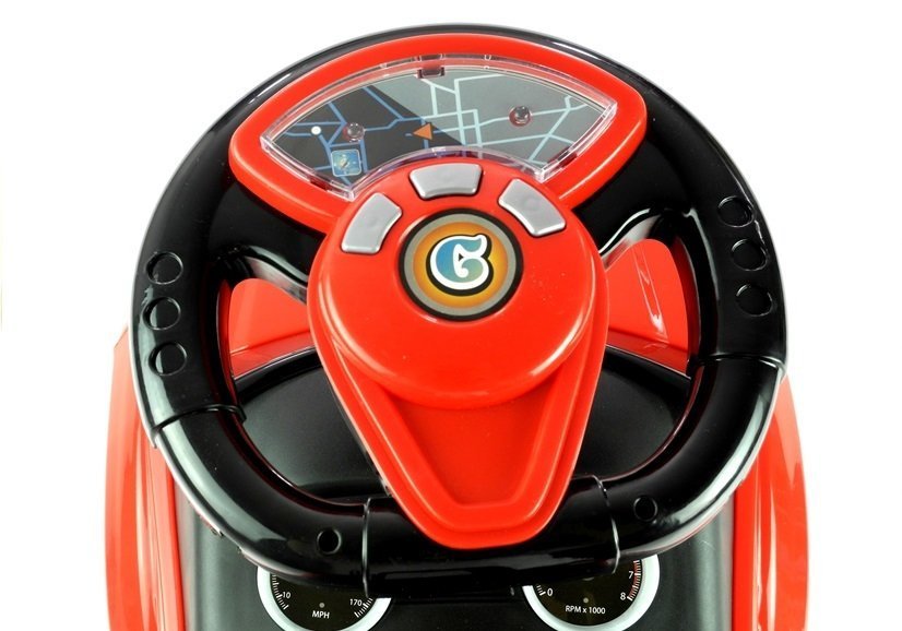 Dużą zaletą tego autka dla dzieci jest multimedialna kierownica oraz wskaźniki prędkości, znajdujące się tuż pod nią. Interaktywna kierownica wyposażona jest w przyciski, które uruchamiają przyjemne dla ucha dźwięki, a także kolorowe światełka. Pięć rodzajów różnych dźwięków sprawi, że maluszek poczuje się w swoim autku jak prawdziwy kierowca.