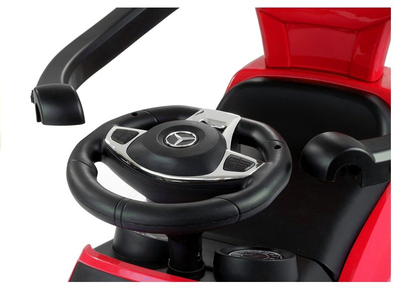 Równie istotną zaletą czerwonego Mercedesa dla dzieci jest muzyczna kierownica. Zasilana dwoma bateriami AAA, które znajdują się w zestawie (montowane od spodu kierownicy), umili dziecku każdą wycieczkę. Znajdują się na niej różne przyciski, które skrywają pod sobą wesołe dźwięki i melodyjki.