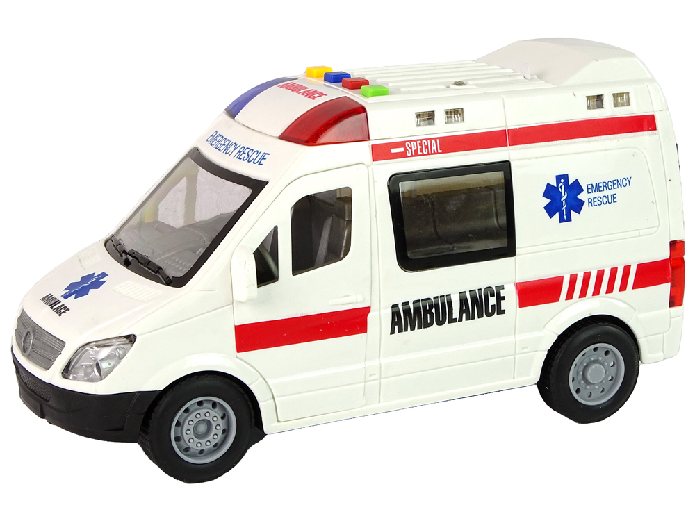 Urocza biała karetka z napędem frykcyjnym to fascynująca zabawka – działa na baterie i posiada 4 kolorowe przyciski, każdy uruchamiający inny dźwięk. Dzieci będą zachwycone możliwością otwierania drzwi i oglądania wnętrza pojazdu, a także włączania świateł, co dodatkowo zwiększa realizm zabawy.