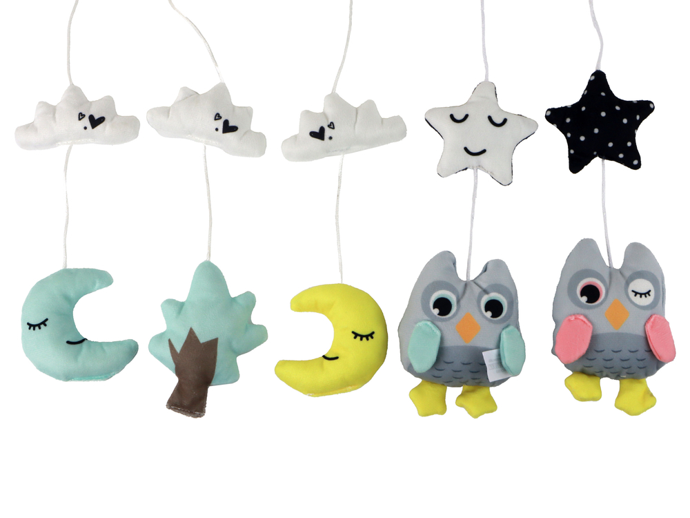 W skład zestawu wchodzi pięć sznureczków z pluszowymi, kolorowymi maskotkami: księżyce, chmurki, gwiazdki, sowy. Każde z nich jest miękkie w dotyku i przyjazne dla dziecka. Mają jasne, intensywne kolory, które przyciągają uwagę malucha i stymulują jego rozwój sensoryczny. Ponadto dołączona do zestawu pozytywka, gra przyjazne melodie oraz sprawia, że całość karuzeli obraca się. To idealne rozwiązanie, aby zapewnić dziecku rozrywkę i stymulację w dowolnym miejscu i czasie.