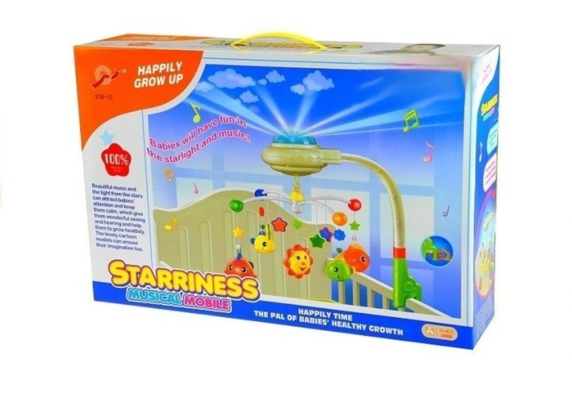Niezwykle interesująca karuzela pomoże zasnąć każdemu maluszkowi. Pozytywka posiada kolorowe zabawki i grzechotkę do zawieszenia i rzutnik, który na suficie wyświetla refleksy świetlne w kształcie gwiazdek i księżyca. Figurki karuzeli można zdemontować i wykorzystać jako oddzielne zabawki.