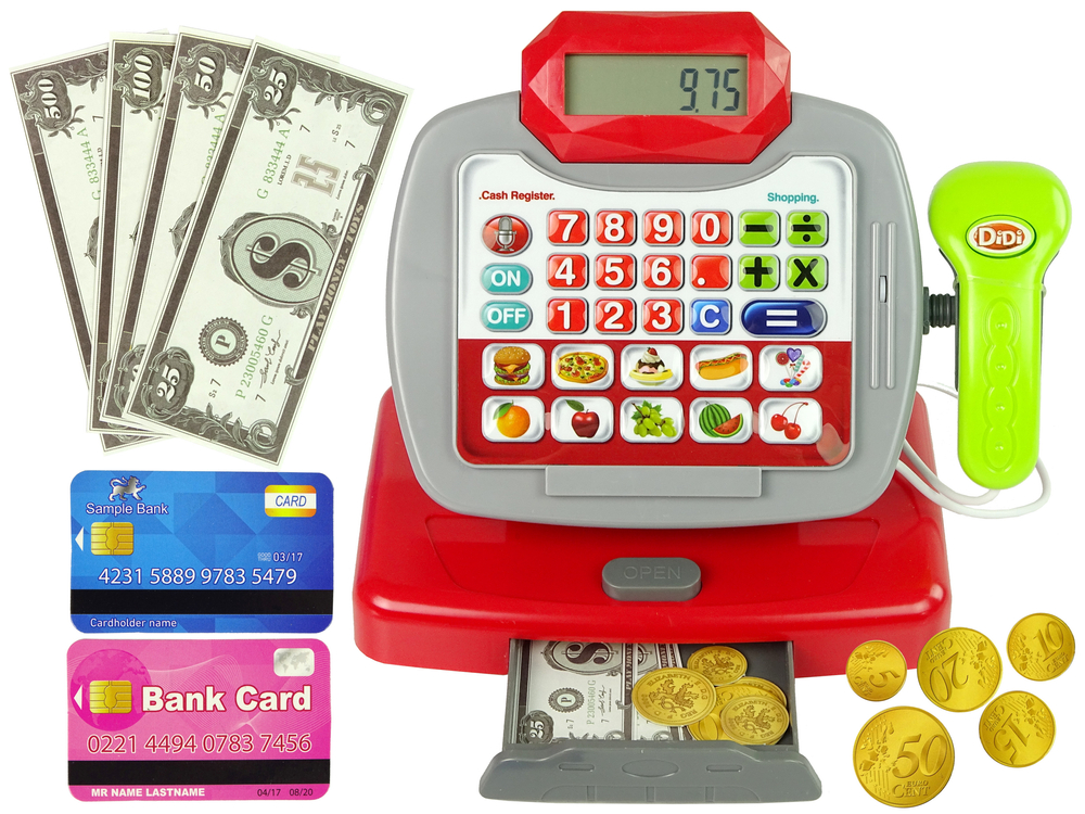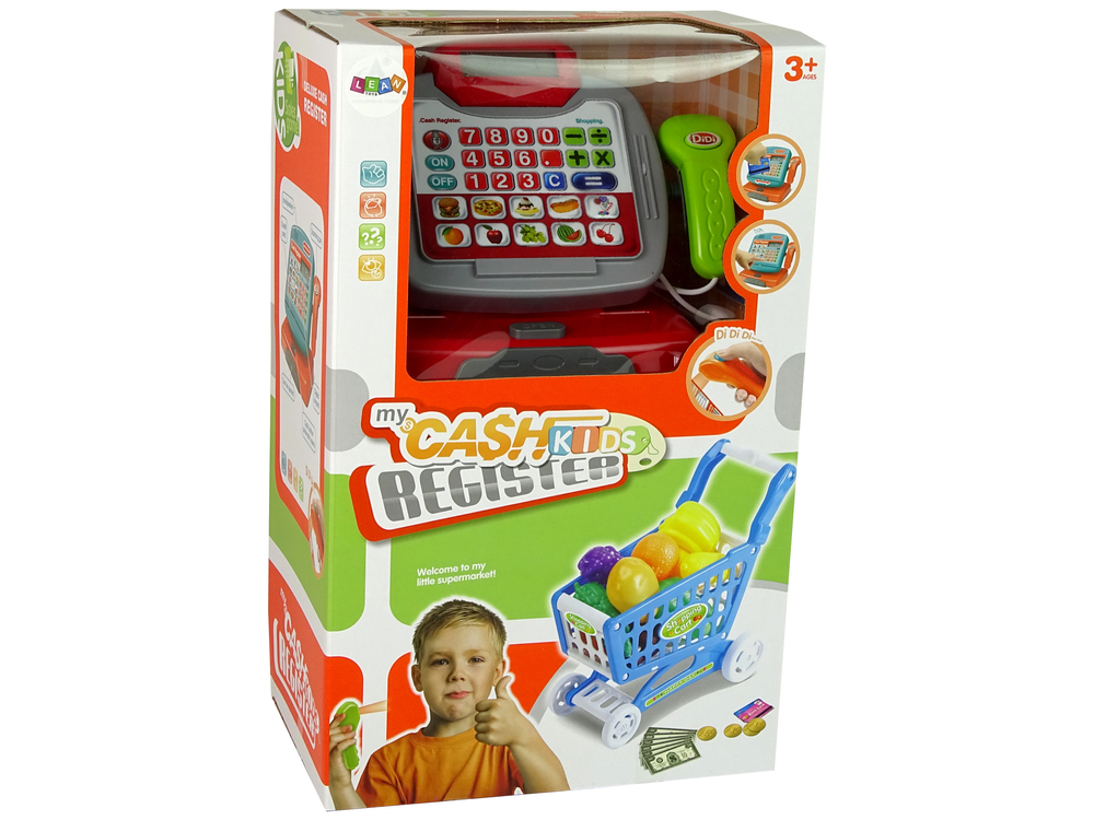 Wózek dołączony do zestawu ma wygodną rączkę, wszystkie zakupy na pewno się zmieszczą. Niebiesko- biały kolor z napisami da poczucie, że maluch znajduje się w prawdziwym sklepie. Drugim wariantem zabawy jest wcielenie się w rolę kasjera. Czerwono- szara kasa ma funkcję kalkulatora, bez problemu doda ceny produktów, ucząc się podstawowych działań. Na dole panelu znajduje się 10 różnych obrazków, różnych produktów np. pizza, winogrono, wiśnia czy arbuz. Przy każdym zeskanowaniu produktu przez skaner słychać piknięcie, a na wyświetlaczu pojawia się kwota. Po zsumowaniu zakupów wystarczy zapłacić gotówką lub kartą. Fikcyjne pieniądze zostały dołączone do zestawu.