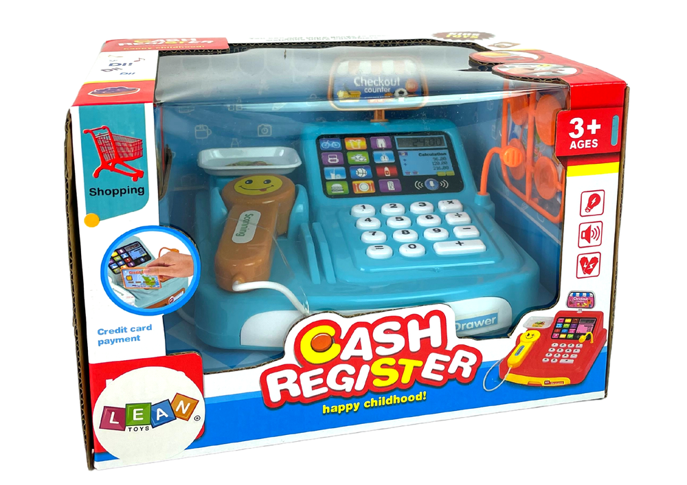Kasa wykonana jest w kolorze niebieskim z elementami pomarańczowym. Monety pozwolą na zapłatę za artykułu spożywcze. Skaner wydaje realistyczny dźwięk, który słyszymy podczas zakupów w markecie.