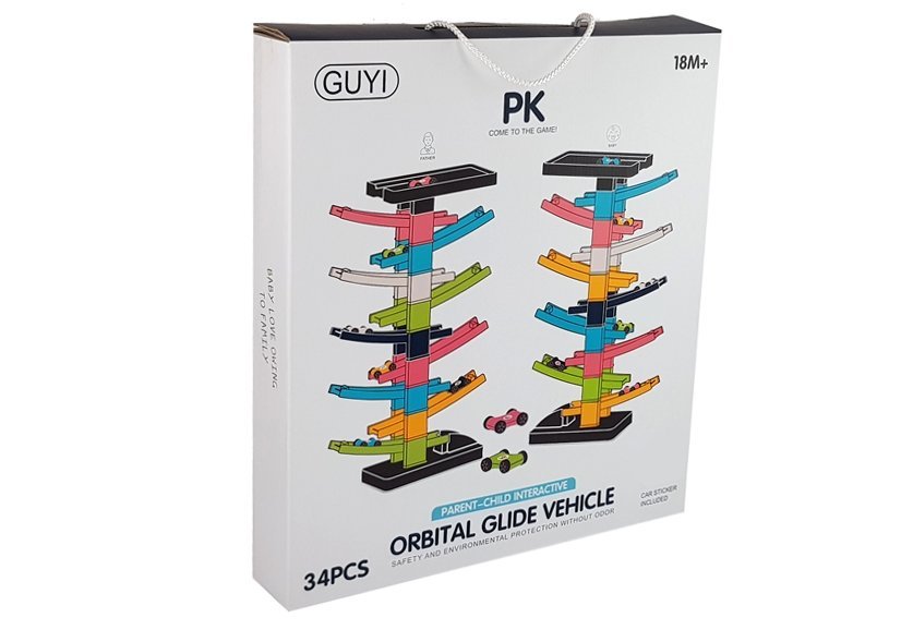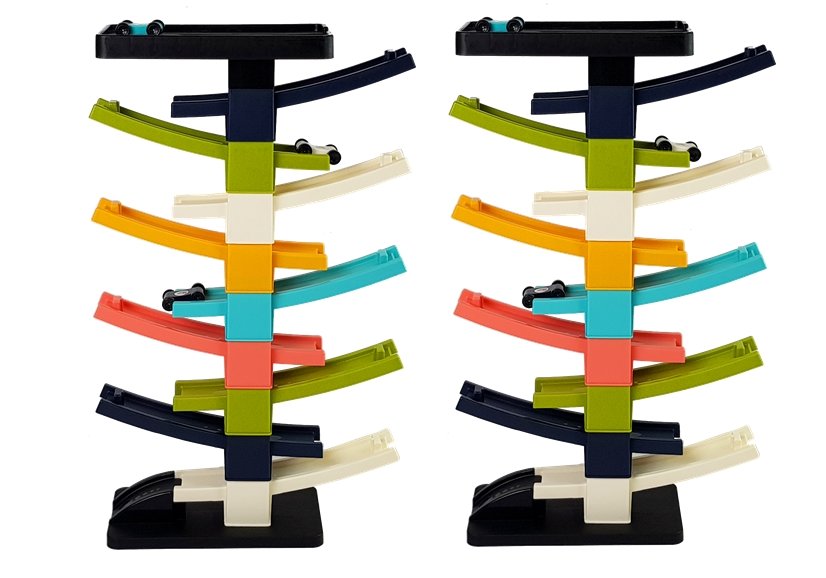 Zjeżdżalnia jest różnokolorowa i do tego posiada 10 pięter, wystarczy położyć autko na szczycie zjeżdżalni i podziwiać jak ślizga się, aż na sam dół. Można urządzić też rywalizację z tatą. Kogo pierwsze autko będzie na dole? Kto wygra?