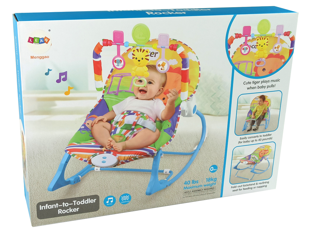Leżaczek dzięki intuicyjnej obsłudze, a przede wszystkim prostej konstrukcji, może być używany na różne sposoby. Z powodzeniem wykorzystasz go jako bujaczek dla maluszka, a także jako klasyczny fotelik dla dziecka, który rozłożysz w każdych warunkach. Wielofunkcyjność siedziska dla malucha sprawia, że możecie zabrać go ze sobą wszędzie, a w zależności od sytuacji zmienić jego zastosowanie. Dodatkowo nad siedziskiem znajduje się okrąg z przyjaznymi małymi maskotkami. Tygrysek po pociągnięciu za rączkę odtwarza muzykę, a boczne wiszące kolorowe zabawki przypominające zwierzątka stymulują zmysł dziecka.