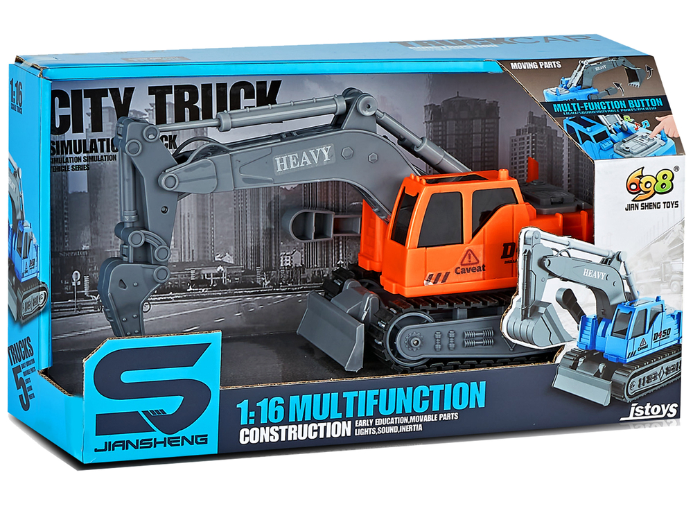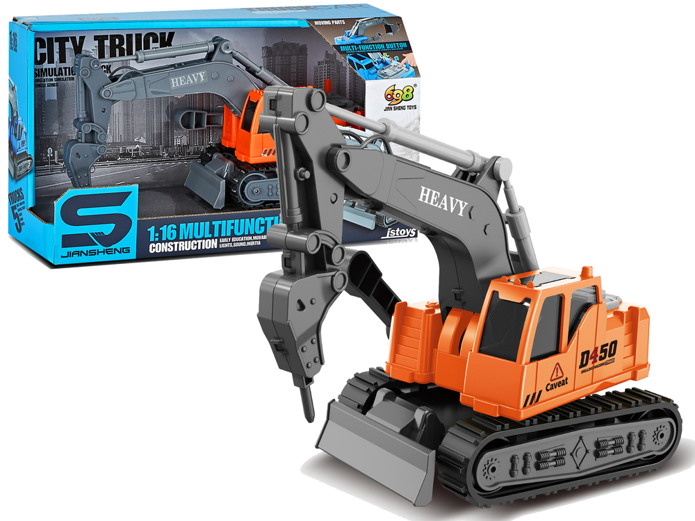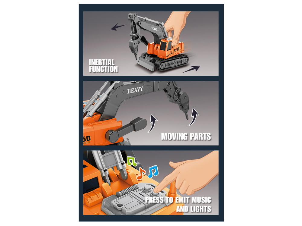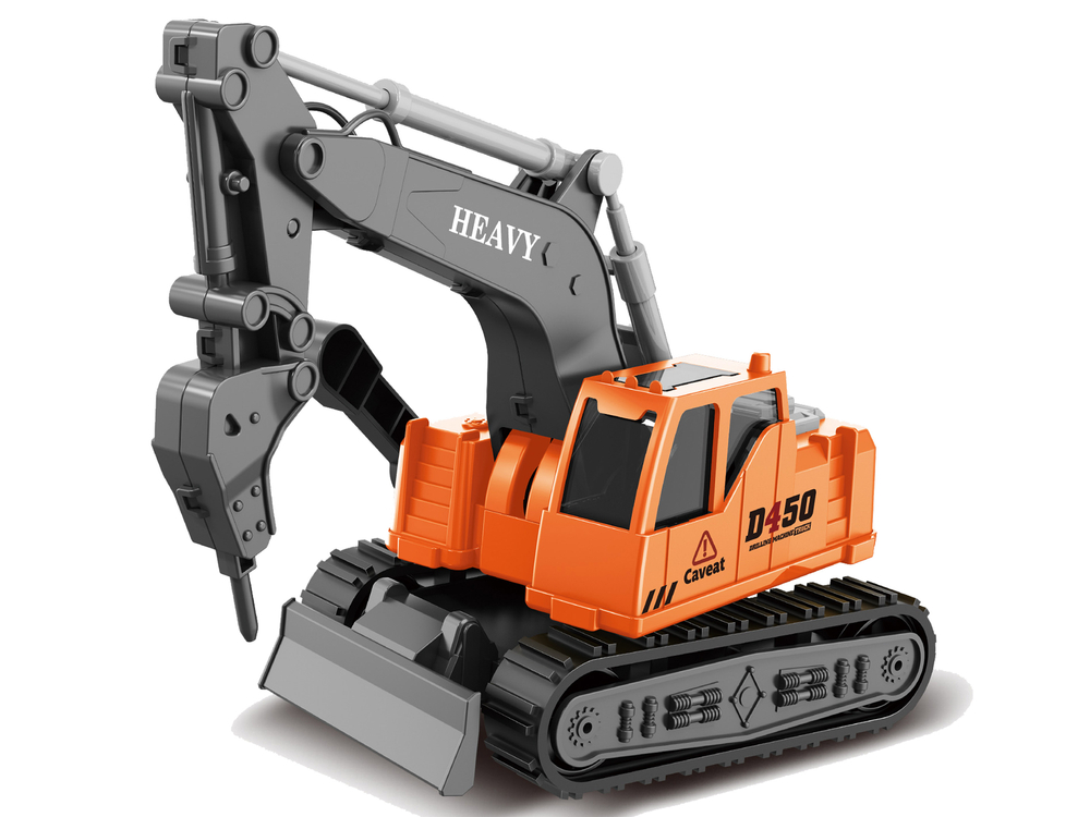 Pojazd budowlany ma wiele zalet. Gumowe koła gąsienicowe gwarantują przyczepność do podłoża. Posiada obrotową o 360 stopni kabinę operatora, a także efekty świetlne i dźwiękowe, które uruchamia się wciśnięciem przycisków. Zabawka została zaprojektowana w skali 1:16, co pozwoliło na dokładne odwzorowanie jej najistotniejszych, charakterystycznych elementów. Długie ramię koparki jest ruchome, można nim poruszać za pomocą wajchy. Ramię na wysięgniku zakończone jest połyskującym, srebrnym wiertłem, które posiada zaokrągloną końcówkę.