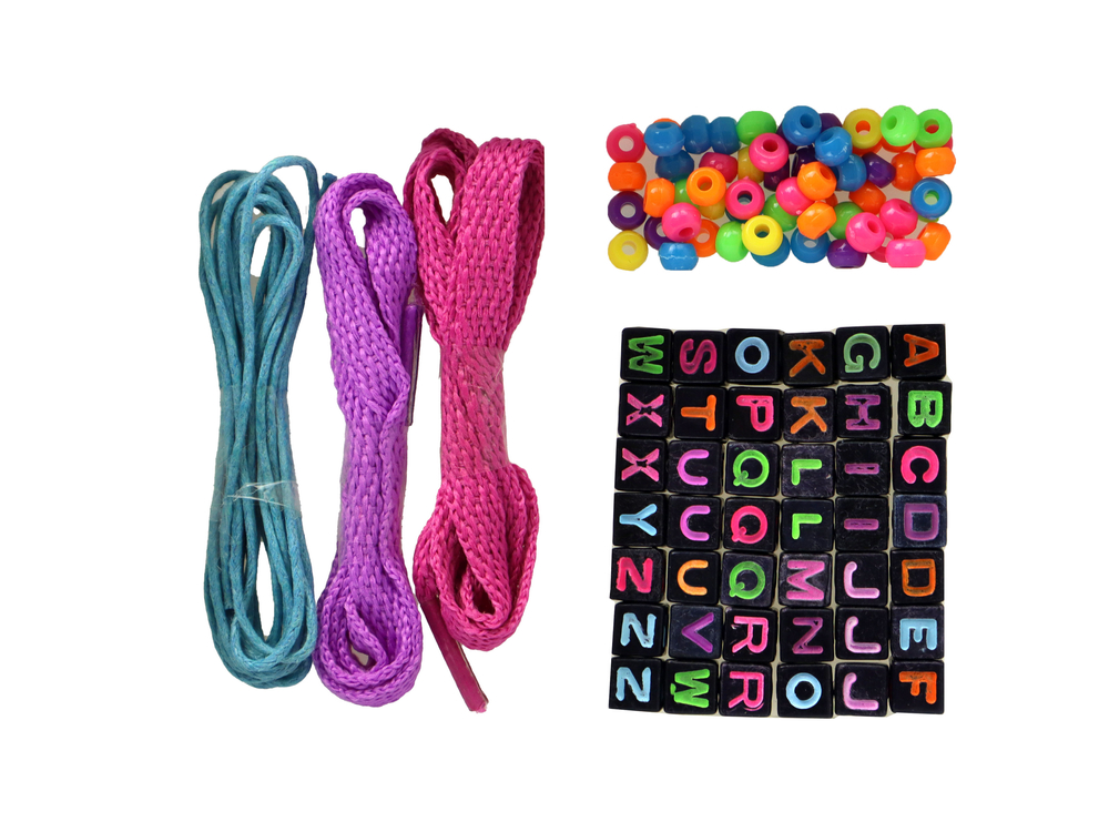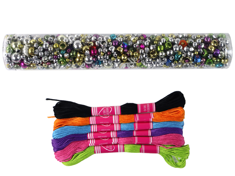 Zestaw zawiera tubkę wypełnioną kolorowymi koralikami o różnych kształtach, wzorach i rozmiarach. Te koraliki stanowią główny materiał do tworzenia biżuterii, a dzieci mogą wybierać spośród różnych wzorów, aby stworzyć interesujące projekty.