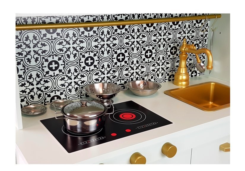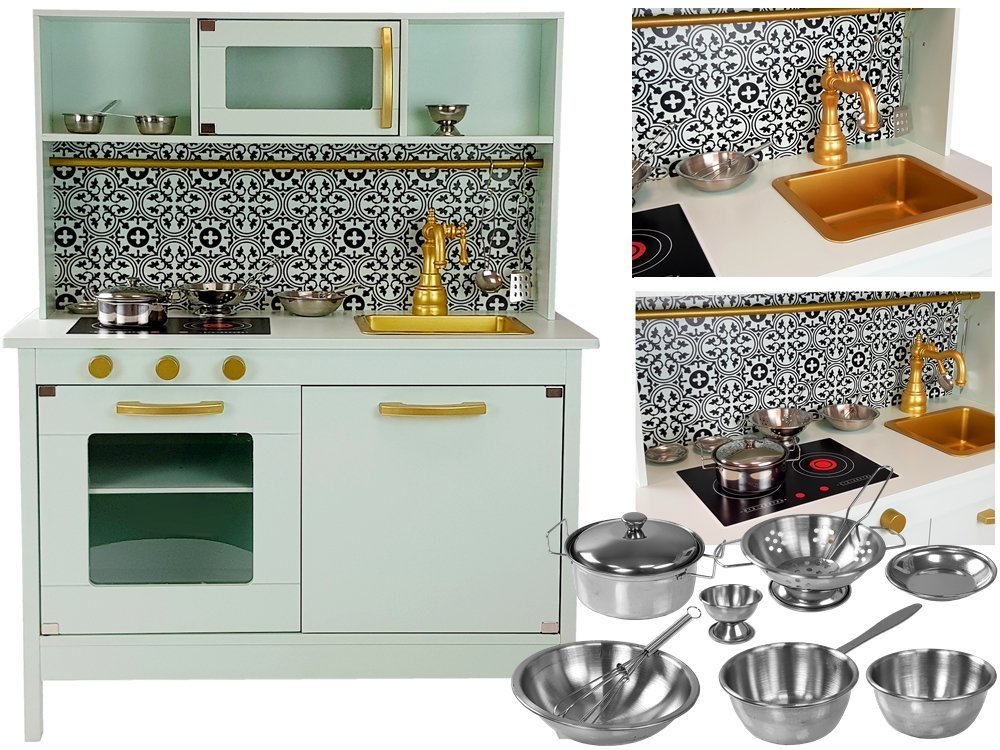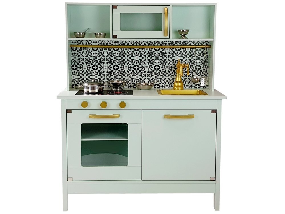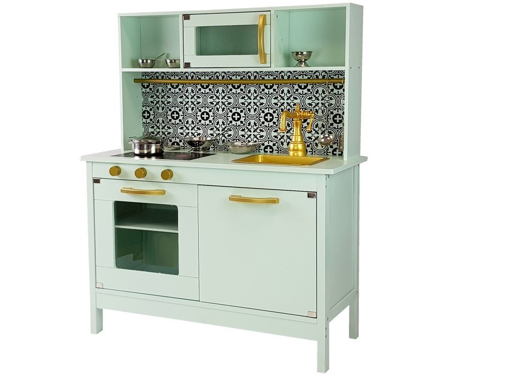 Kuchnia posiada wiele pokręteł i drzwiczek co sprawi, że kilkulatek rozwinie swe umiejętności motoryczne i odruch chwytania przedmiotów o różnym kształcie. Cała kuchnia ma kolor miętowy z pięknymi złotymi pokrętłami i niespotykanym kranem. Blat ma również kolor miętowy znajduje się na nim zlewozmywak i palniki, na który można gotować cudne potrawy. Nad zlewozmywakiem zamontowane są szafki, jedna z nich ma szybę i otwierane drzwiczki. Półeczki pod spodem pozwolą na utrzymanie porządku oraz przechowywanie wielu garnków i produktów spożywczych. Do całości zestawu dołączone są super akcesoria do kuchni, dzięki którym można przygotować śniadanie, czy obiad. Pomiędzy górnymi i dolnymi szafkami jest piękny czarno- biały wzór, który zachwyci małego kucharza. Idealnie wpasuje się do każdego wnętrza, a zwłaszcza do pokoju dziecięcego.