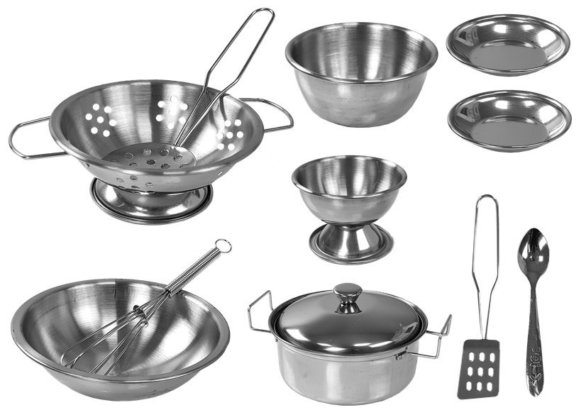 – akcesoria kuchenne nierdzewne: durszlak, garnek z pokrywką, rondelek, talerzyki, miska, sztućce