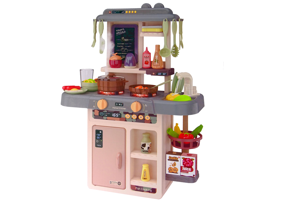 Kuchnia składa się z realistycznie wyglądającej kuchenki, piekarnika oraz lodówki. Dziecko może łatwo udawać, że gotuje, piecze lub przygotowuje inne posiłki za pomocą różnych funkcji kuchni. W zestawie znajdują się wszystkie niezbędne akcesoria, takie jak garnki, patelnie, sztućce, talerze, inne przybory kuchenne oraz produkty spożywcze, z których Maluch może przygotować różnorodne potrawy!