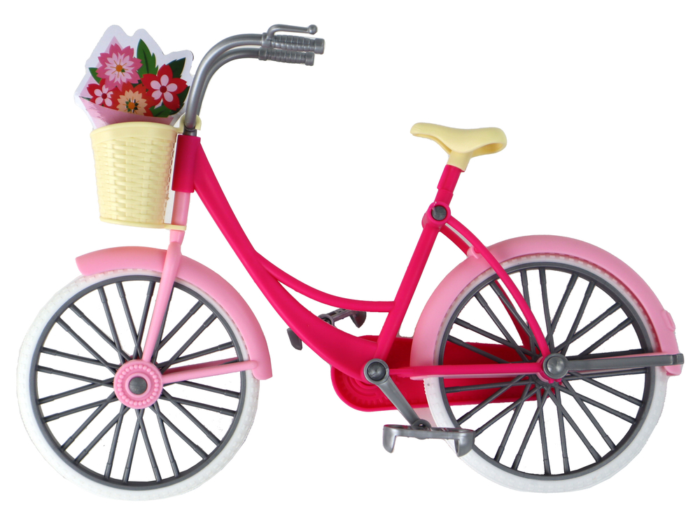 W zestawie znajduje się rower w odcieniach różowego. Rower ma duże, biało-szare koła, co sprawia, że jest stabilny i łatwy w prowadzeniu. Rower wyposażony jest w koszyk na przodzie, który zawiera bukiet kwiatów, co dodaje uroku i nadaje rowerowi przyjaznego wyglądu. Siodło roweru i koszyk są w kolorze beżowym, co dodaje całości elegancji.