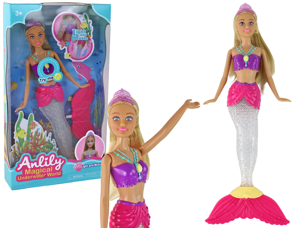 Nasza Lalka Syrenka z długimi, pięknymi blond włosami, koroną na głowie i przepięknym różowo-fioletowym strojem, ta lalka emanuje elegancją i urokiem. Jej przeźroczysty ogon to prawdziwa niespodzianka. Po wciśnięciu guziczka ogon zmienia się w kolorowy efekt świetlny, tworząc magiczną atmosferę pod wodą.