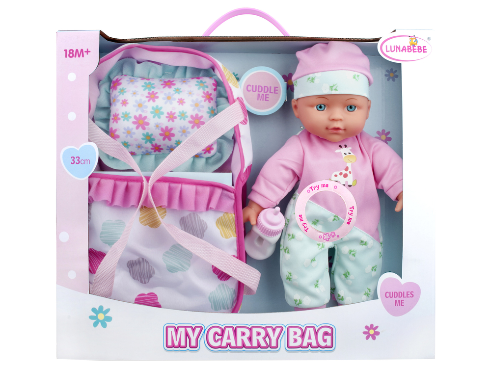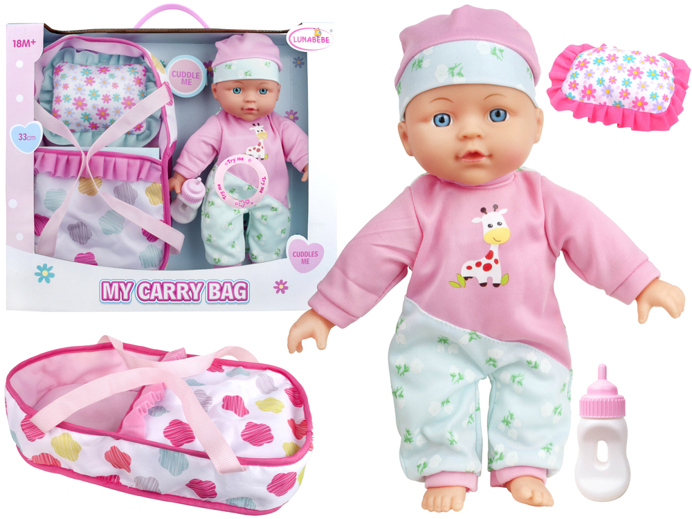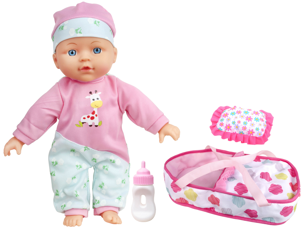 Całość idealnie pasuje do siebie. Po naciśnięciu na tors lalki usłyszymy dźwięki charakterystyczne dla małego dziecka: płacz, gaworzenie, słowo ” mama” itd. Przy każdym naciśnięciu zaskoczy dźwiękami. Lalka ma ruchome ręce i nogi, ubranko jest zdejmowane, co pozwoli na wymianę garderoby.